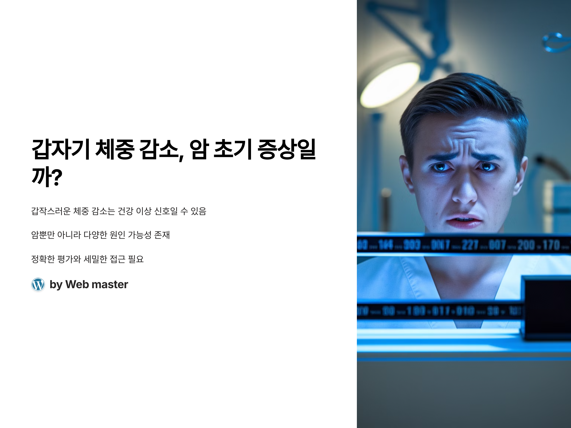 갑작스러운 체중 감소는 종종 건강의 이상 신호로 간주됩니다. 특히 체중이 눈에 띄게 줄어들었을 때, 암과 같은 심각한 질병을 의심할 수 있습니다. 하지만 체중 감소는 여러 원인으로 발생할 수 있으므로, 암 초기 증상의 가능성을 정확하게 평가하려면 좀 더 세밀한 접근이 필요합니다. 이 글에서는 갑자기 체중이 줄어들었을 때 나타날 수 있는 암 초기 증상과 다른 가능한 원인들에 대해 다뤄보겠습니다. 또한, 이러한 증상에 대처하는 방법과 예방적인 조치들도 함께 알아보겠습니다.