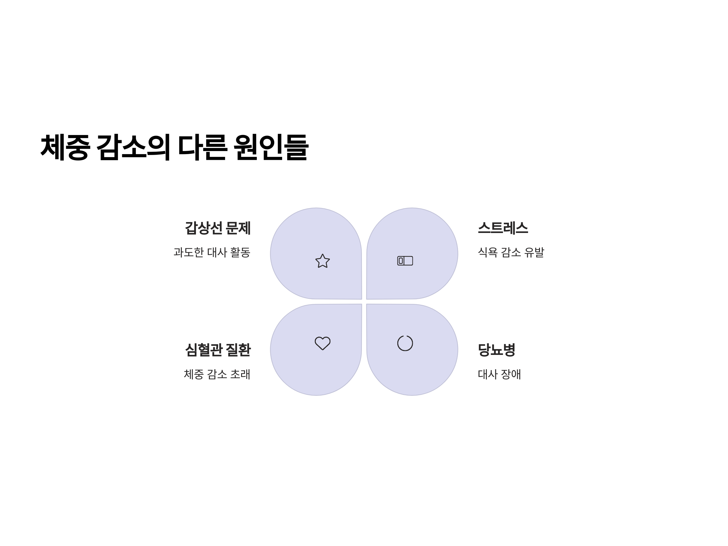 체중 감소가 반드시 암 때문만은 아닙니다. 스트레스, 갑상선 문제, 소화기 질환, 당뇨병, 심혈관 질환 등 다양한 건강 문제가 체중 감소를 초래할 수 있습니다. 예를 들어, 갑상선 기능 항진증이 있는 경우 과도한 대사 활동으로 인해 체중이 줄어들 수 있습니다. 또한, 장기적인 스트레스나 우울증도 식욕을 감소시키고, 이로 인해 체중이 빠질 수 있습니다.