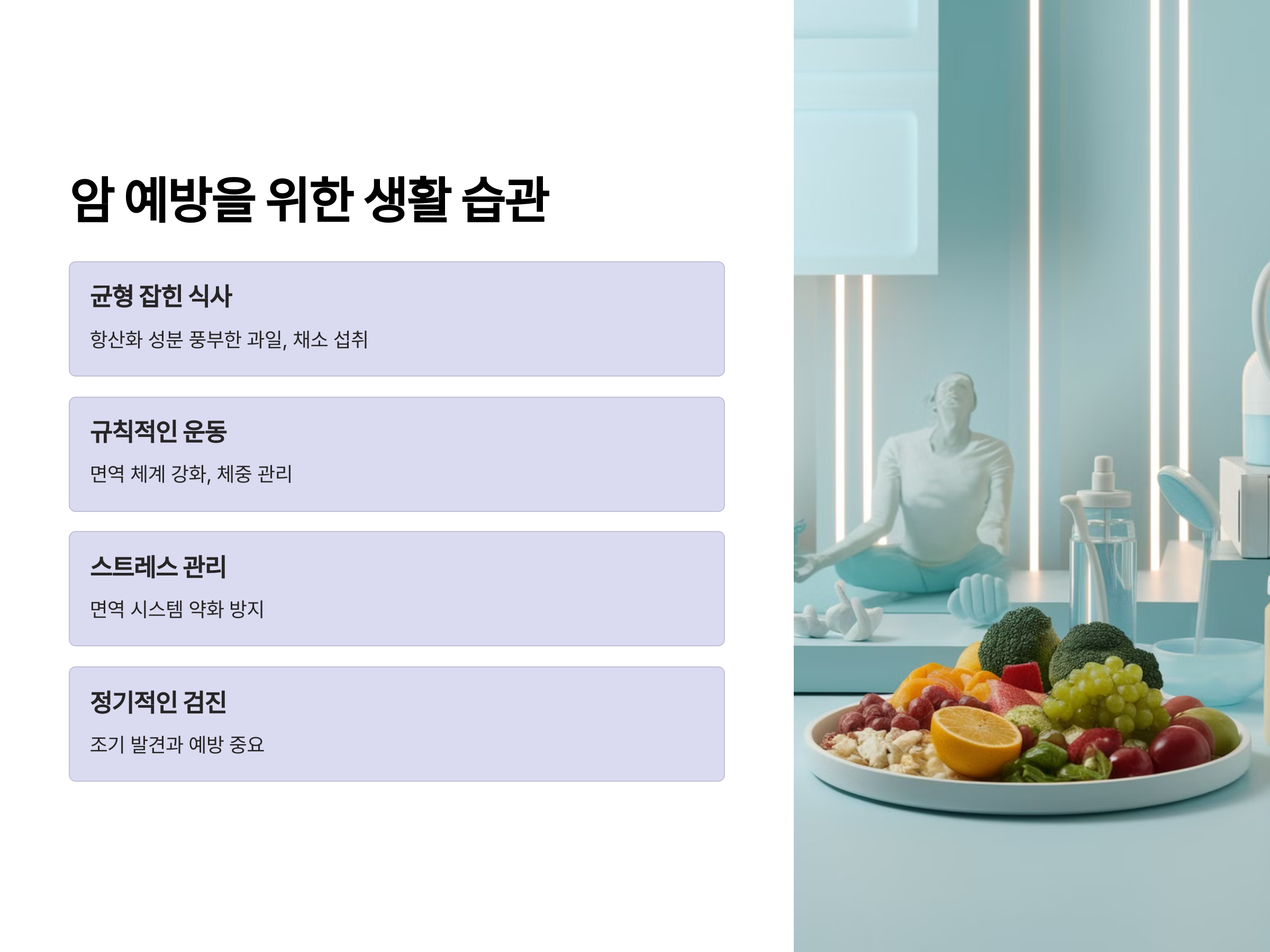 암을 예방하는 데 있어 중요한 것은 건강한 생활 습관을 유지하는 것입니다. 다음과 같은 생활 습관을 지키는 것이 암 예방에 도움이 됩니다.