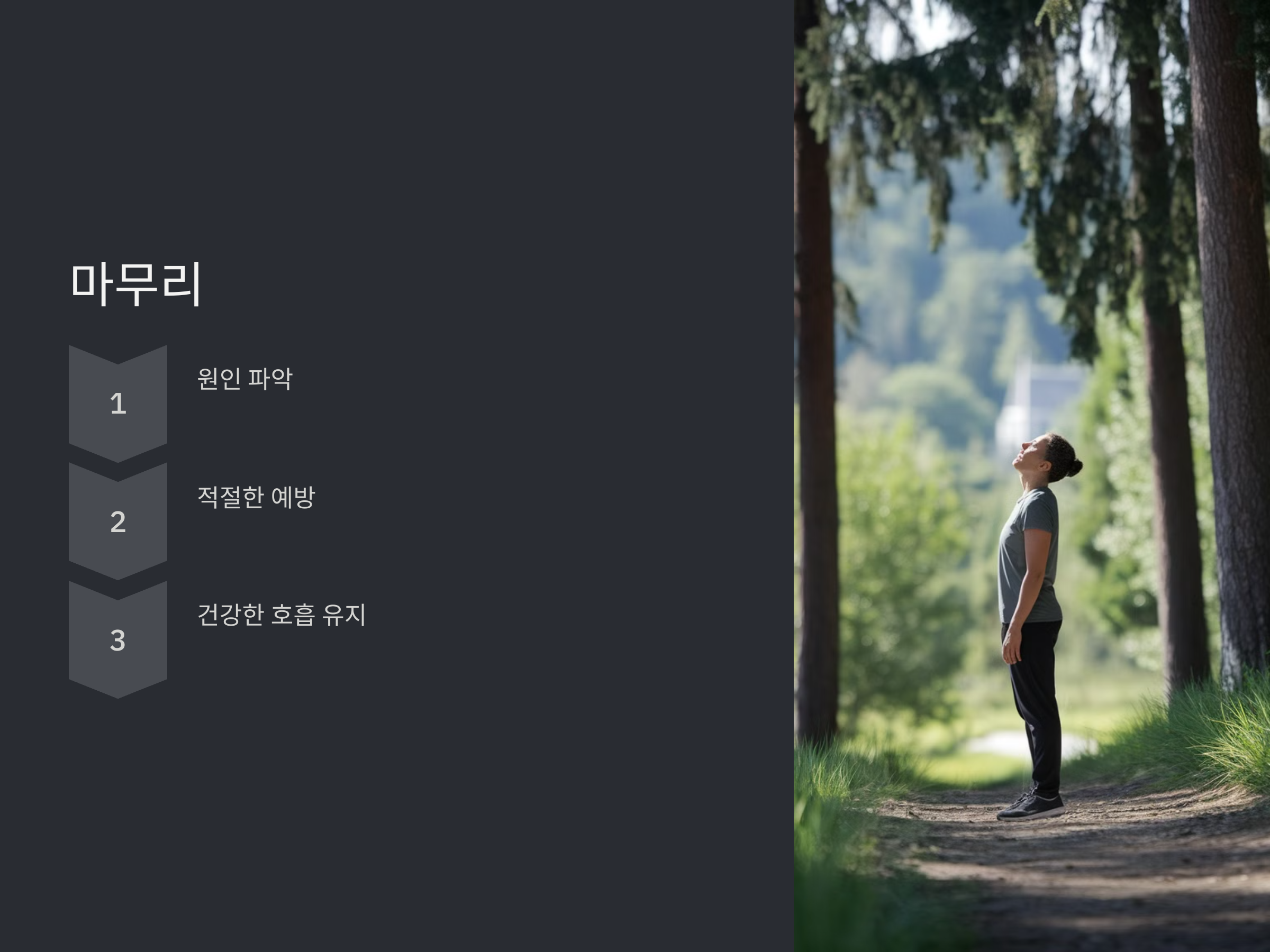 - 규칙적인 운동: 천천히 강도를 올리며 호흡을 조절하는 운동(예: 요가, 수영)