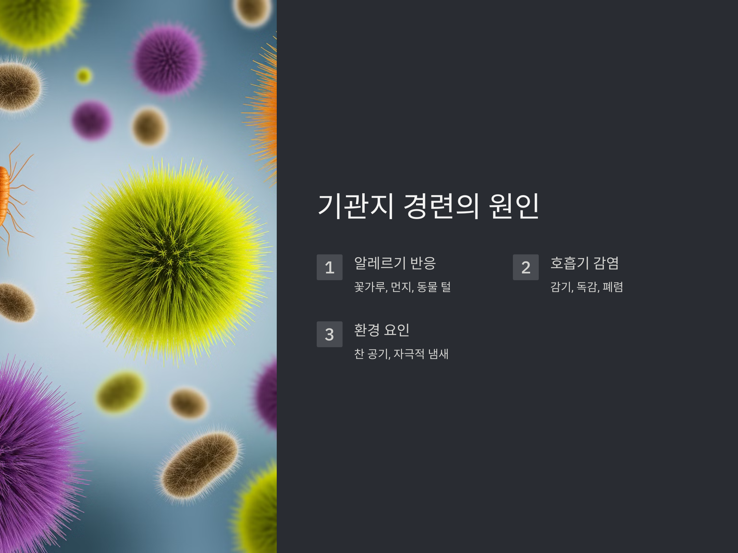 - 호흡기 감염: 감기, 독감, 폐렴 등이 기관지를 자극하여 경련을 일으킬 수 있음