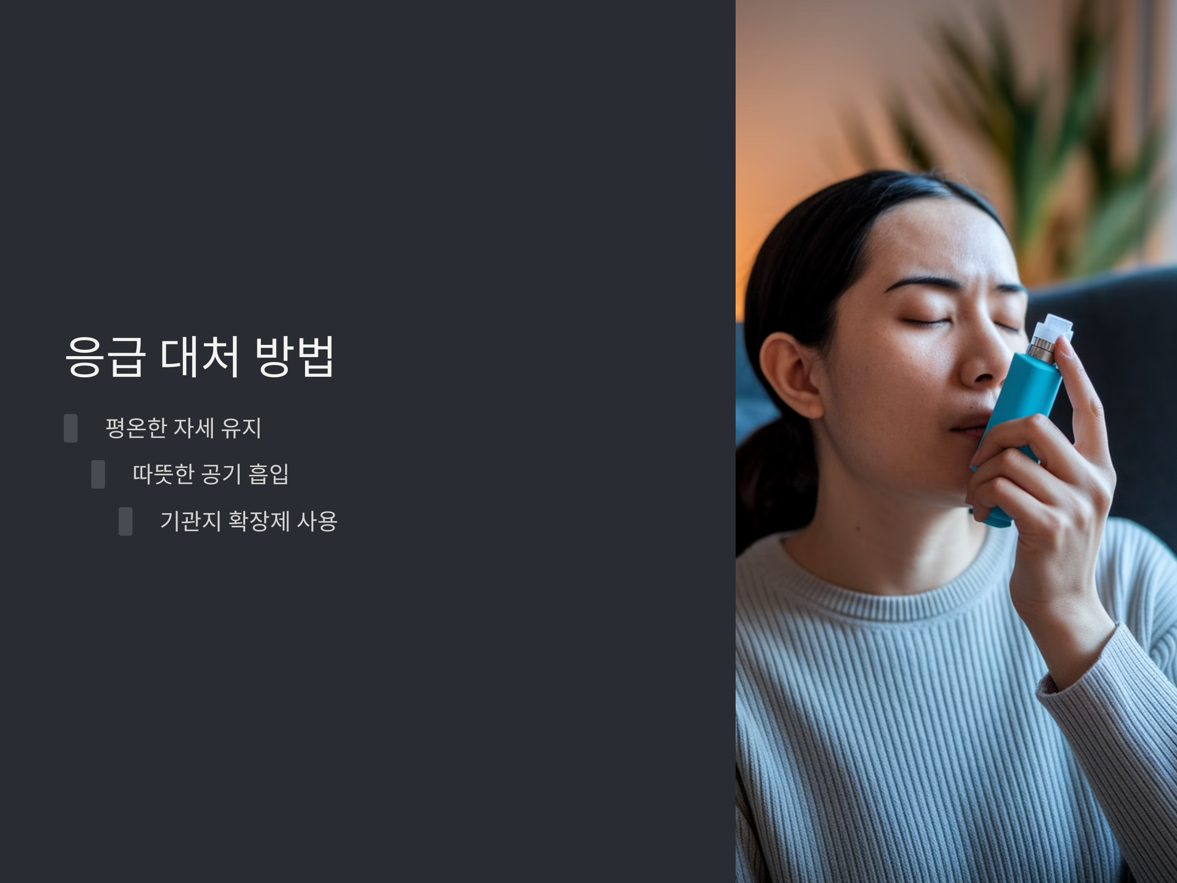- 기관지 확장제 사용: 천식 환자의 경우 처방받은 흡입기를 사용