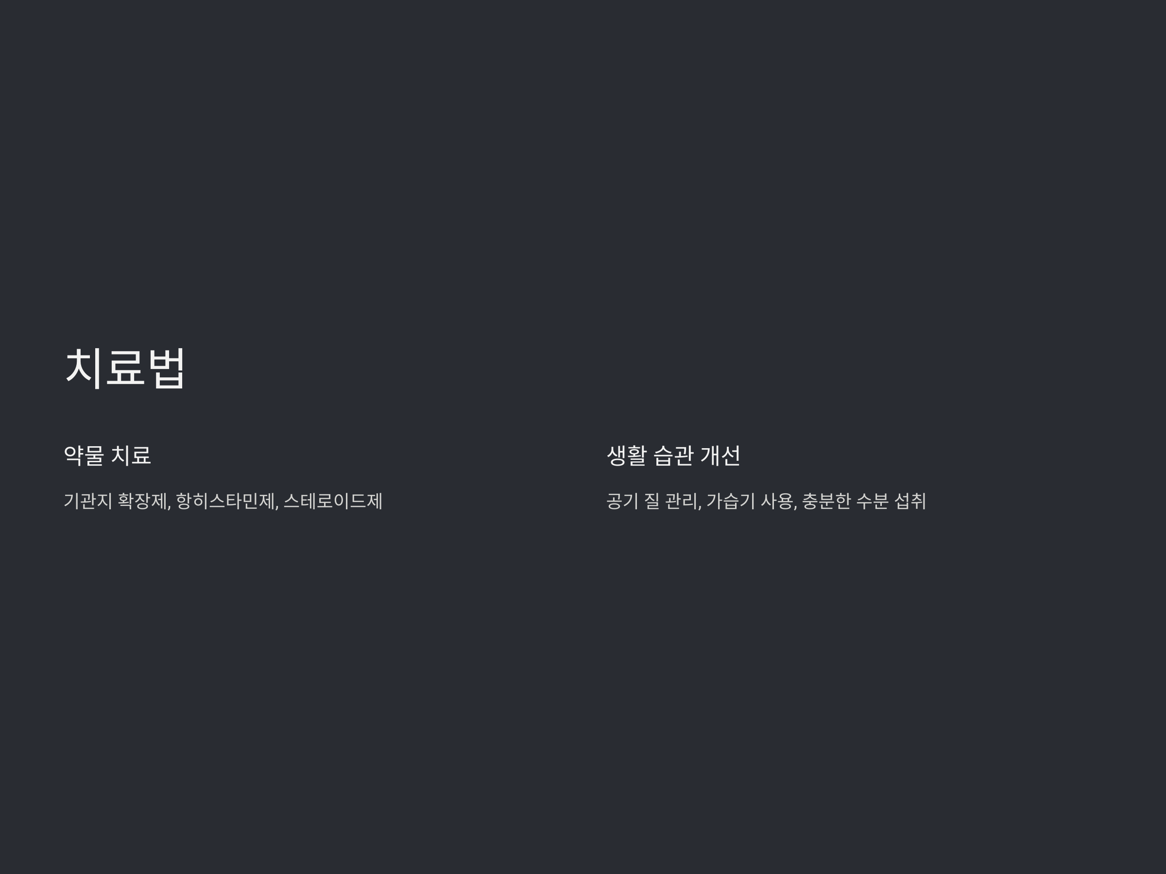 - 스테로이드제: 염증을 줄이고 기관지 과민 반응을 완화