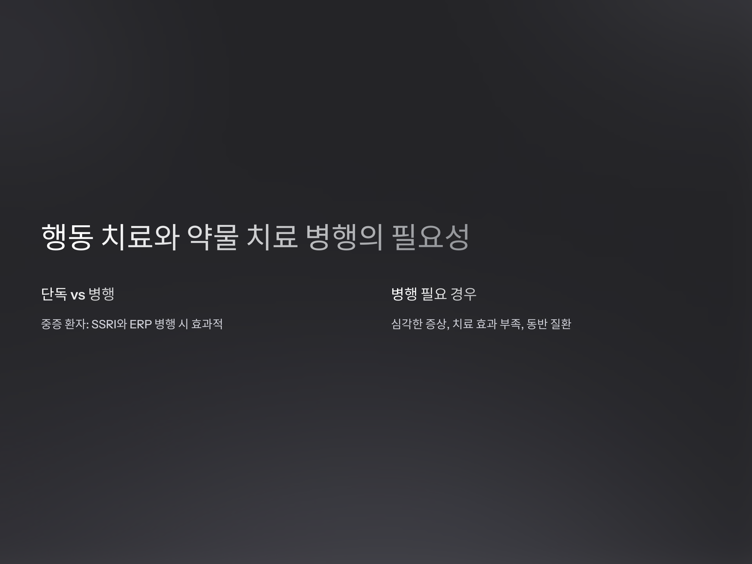 행동 치료만으로 충분한 효과를 보는 경우도 있지만, 중증 강박 장애 환자의 경우 SSRI와 병행 치료를 하면 더 나은 결과를 얻을 수 있습니다. 특히, 초기에는 SSRI를 복용하면서 ERP 치료를 병행하여 강박 사고를 조절하고 점차 약물 의존도를 줄이는 방향으로 진행하는 것이 일반적입니다.