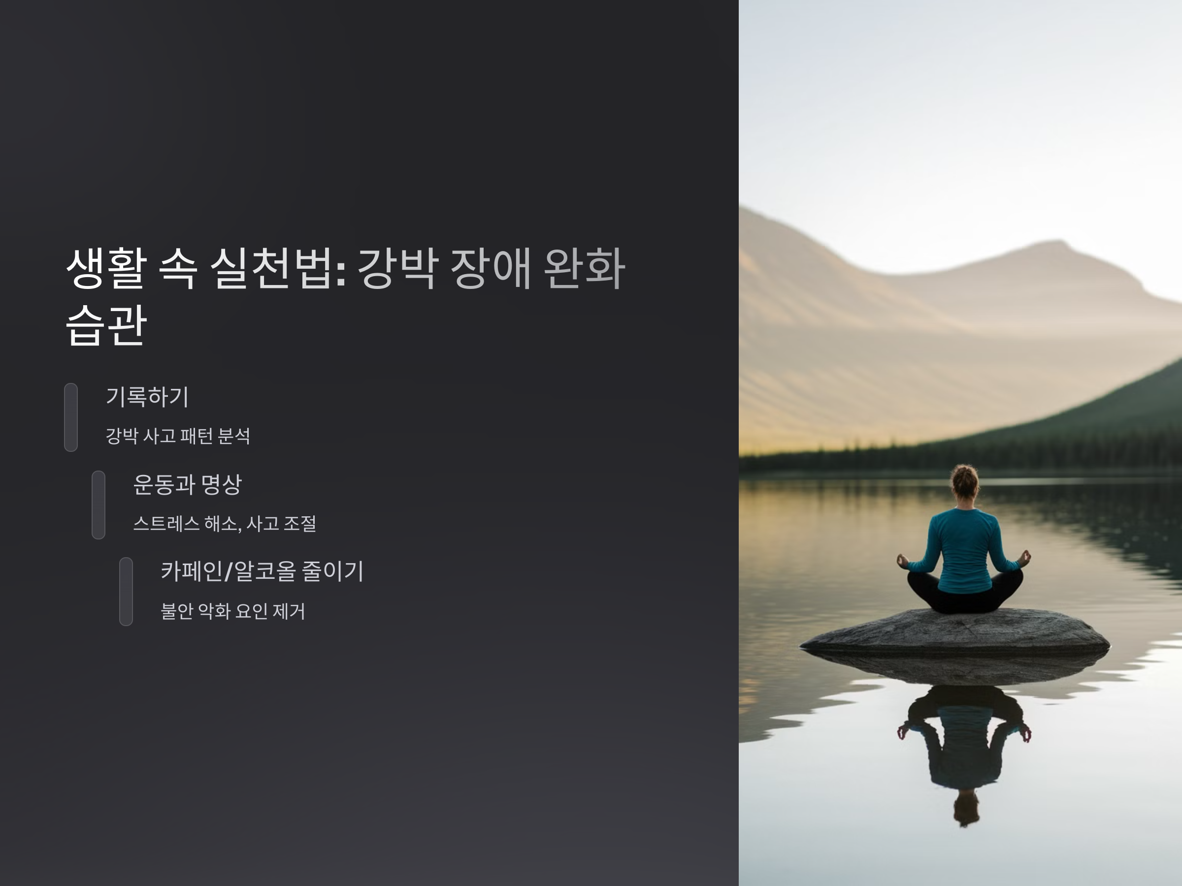 - 대안적 사고 개발: 강박적 사고가 들 때, 긍정적이고 현실적인 생각으로 대체하기