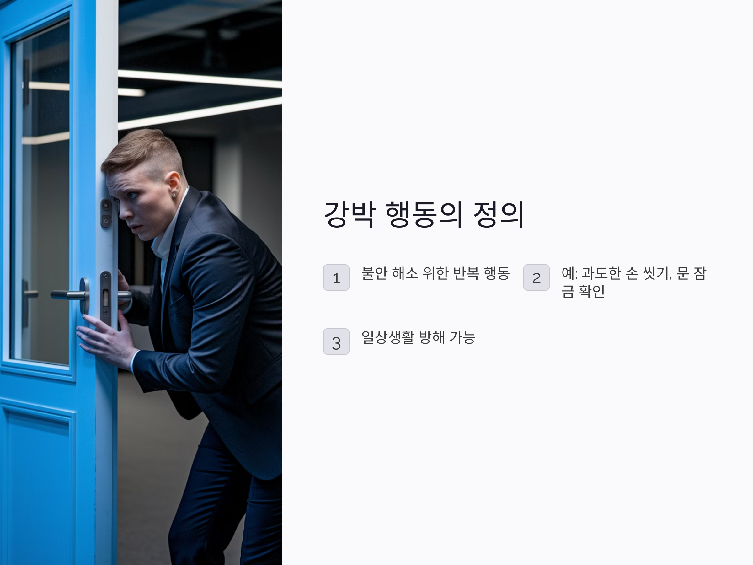 강박 행동은 불안을 해소하기 위해 특정 행동을 반복적으로 수행하는 것으로 정의됩니다. 예를 들어, 손을 씻는 것, 문을 잠그는 것을 여러 번 확인하는 것 등이 이에 해당할 수 있습니다. 강박적 사고는 종종 사람들에게 불안을 초래하며, 그 불안을 잠재우기 위해 특정 행동을 반복하도록 만듭니다.