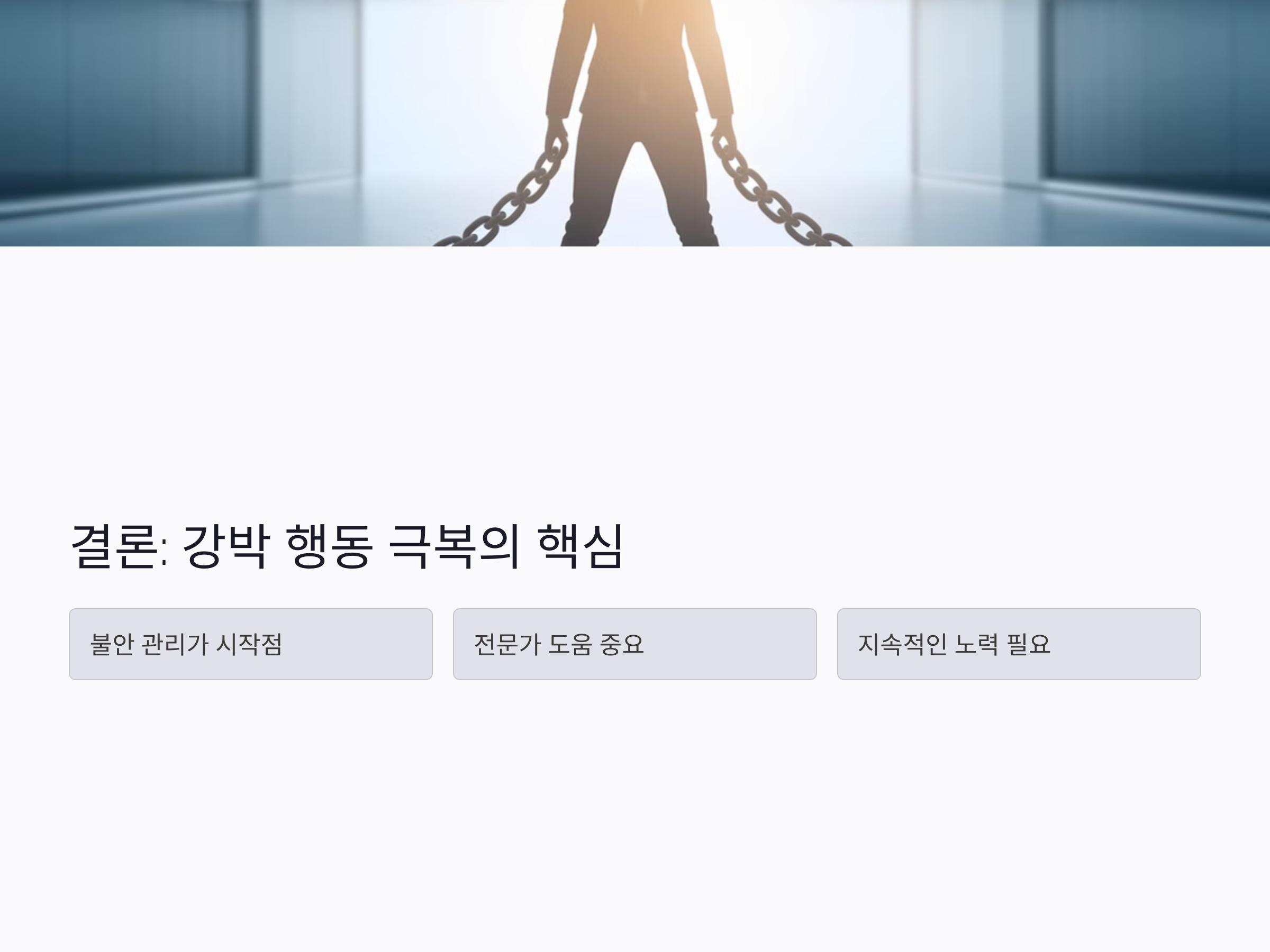 따라서 불안의 근본적인 원인을 해결하는 것이 중요합니다. 강박 행동을 치료하기 위해서는 불안을 직접적으로 다루는 방법이 필요하며, 강박적 사고를 관리하는 방법이 요구됩니다.