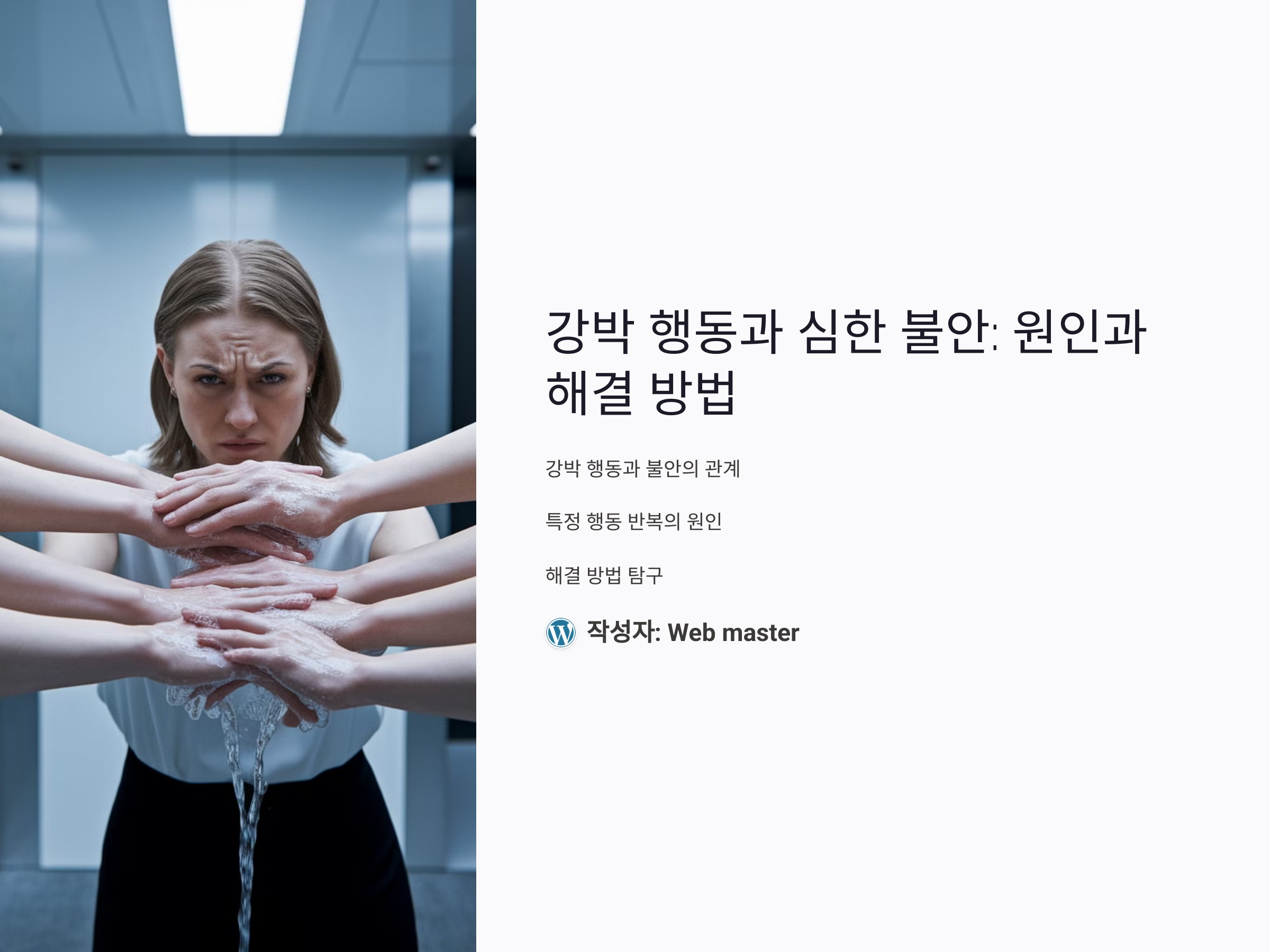 강박 행동은 심한 불안과 밀접하게 연결되어 있으며, 특정 행동을 반복함으로써 불안을 해소하려는 시도가 반복적인 행동으로 이어질 수 있습니다. 이러한 행동은 일시적인 안도감을 줄 수 있지만, 장기적으로는 불안을 더 악화시킬 수 있습니다. 강박 행동을 극복하기 위해서는 인지행동치료나 심리적 훈련을 통해 불안의 원인을 직접적으로 다루고, 강박적인 사고와 행동을 관리하는 것이 중요합니다. 결국, 강박 행동의 해결은 불안 관리에서 시작된다고 할 수 있습니다.