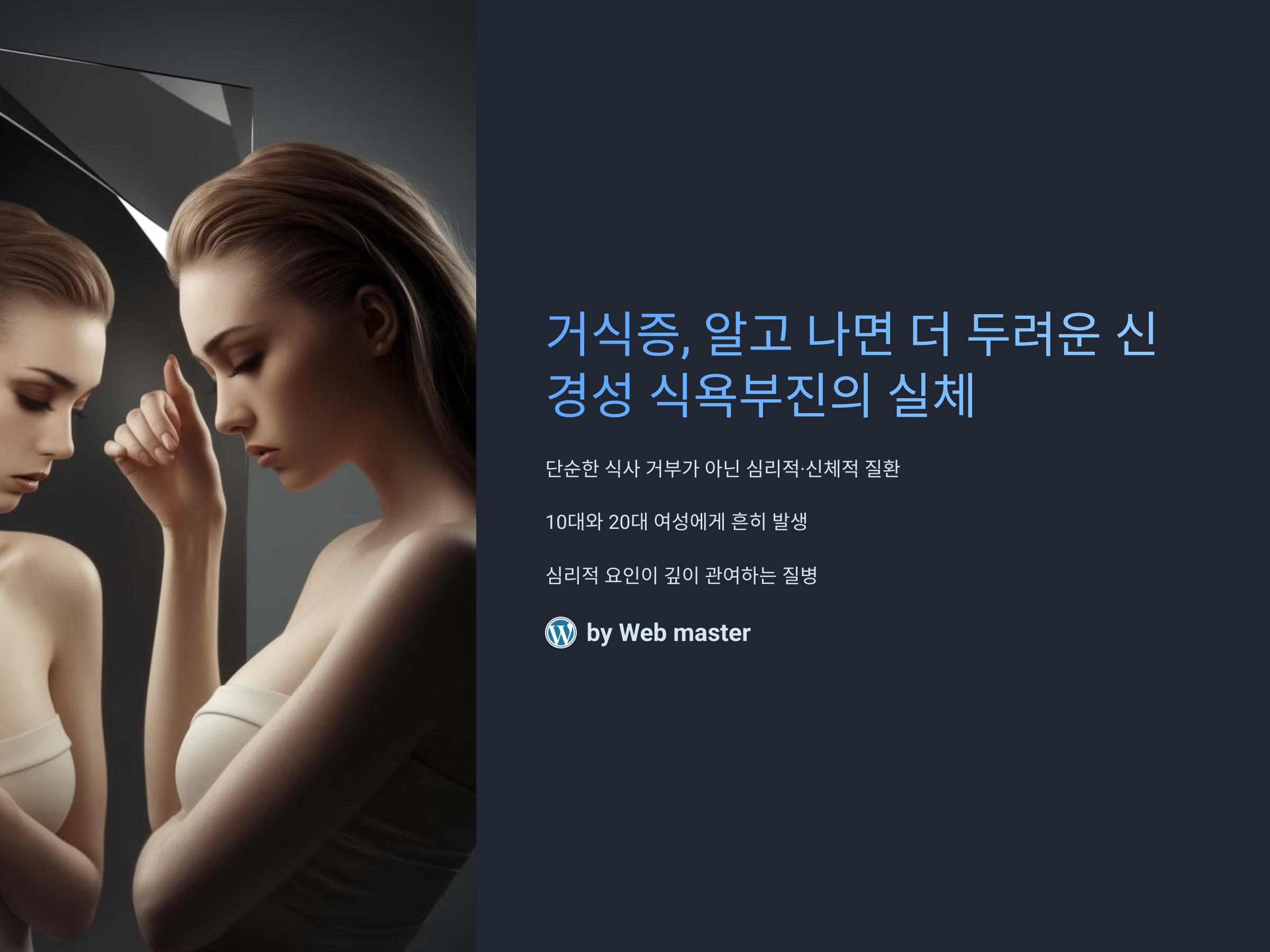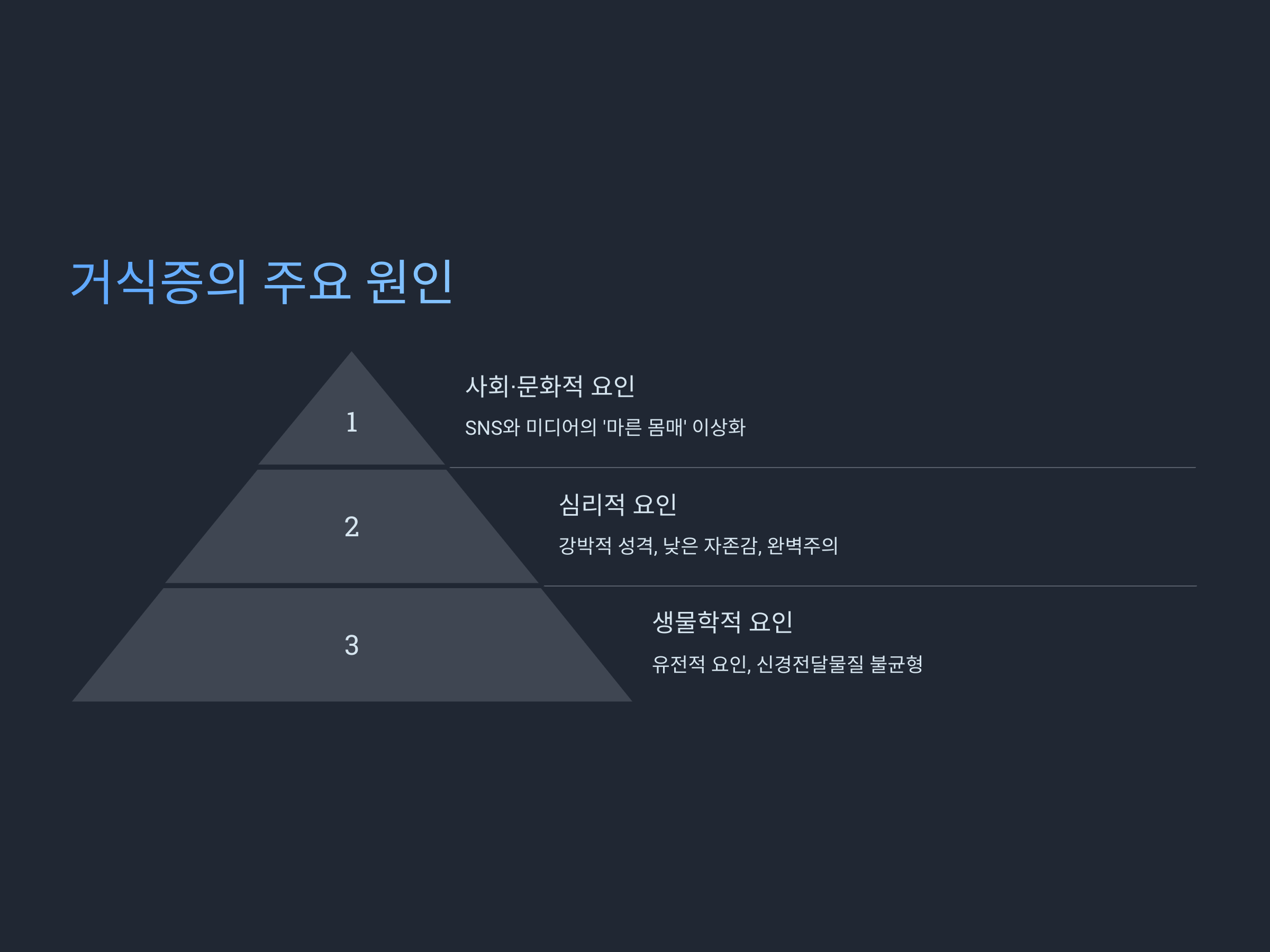 거식증의 원인은 단순한 식습관 문제가 아니라, 생물학적·심리적·사회적 요인이 복합적으로 작용하는 질환입니다.