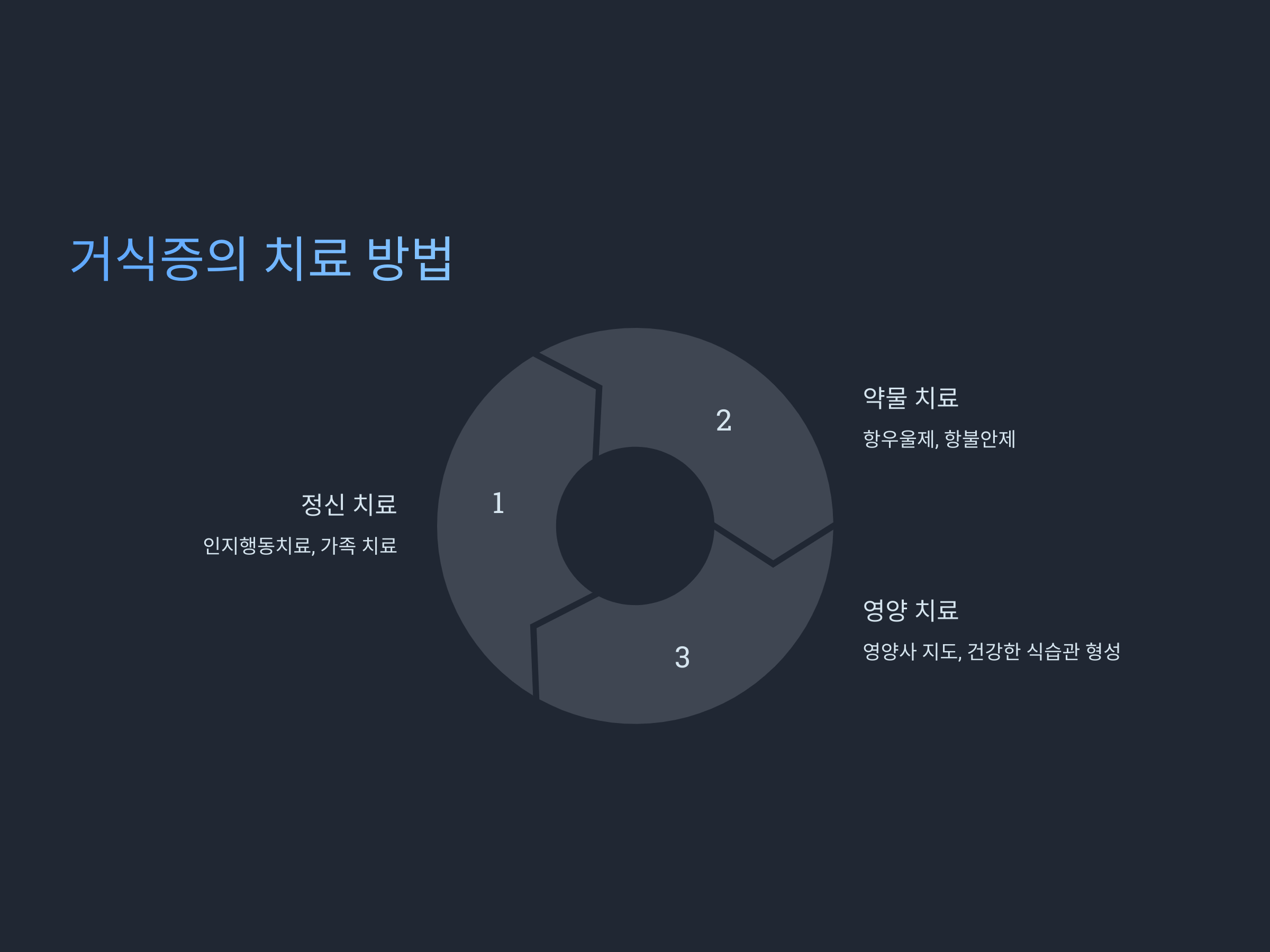 거식증 치료는 정신적·신체적 건강을 동시에 회복하는 것이 목표입니다. 일반적으로 심리치료, 약물치료, 영양 상담이 병행됩니다.