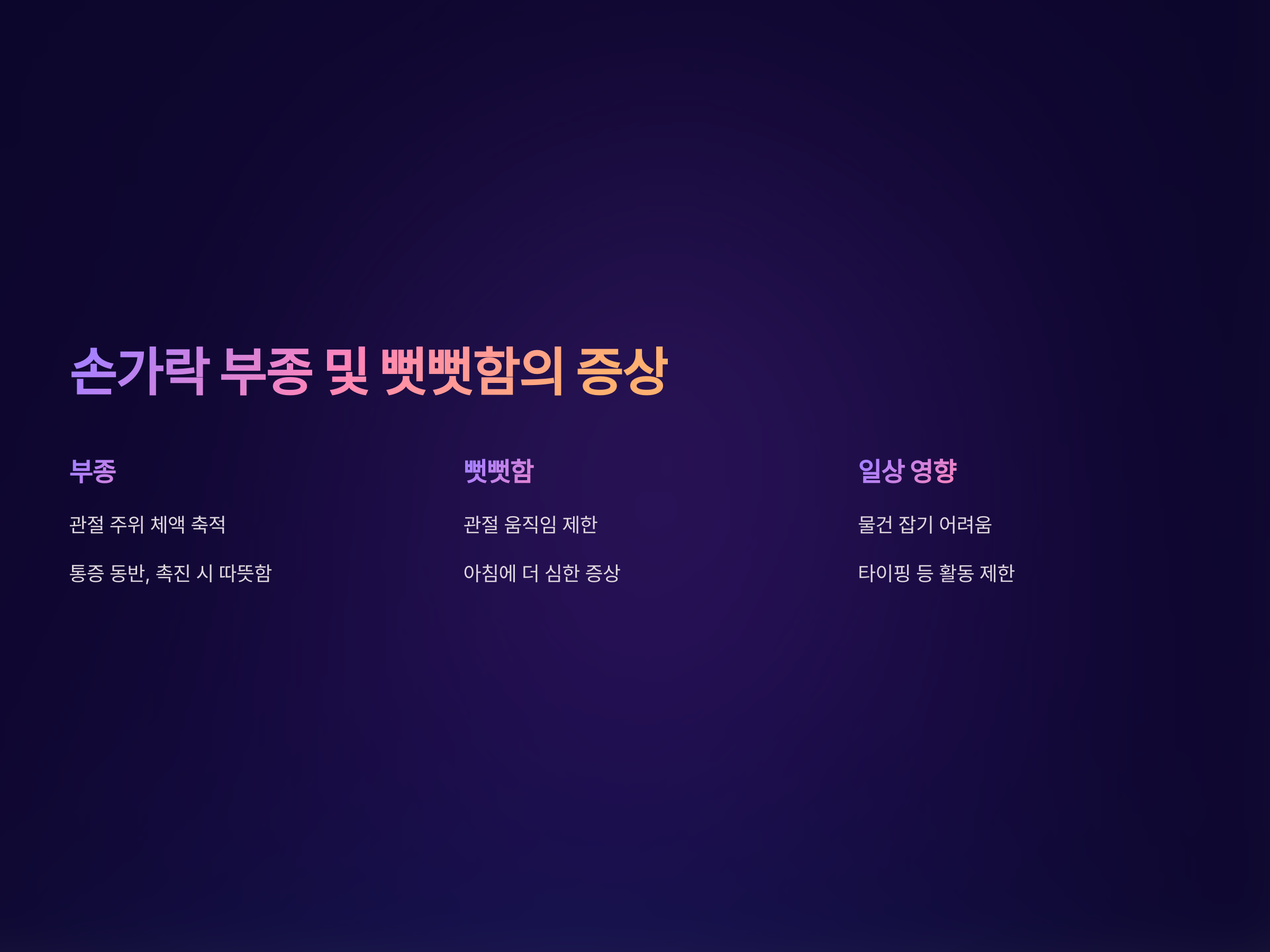 손가락의 뻣뻣함은 관절의 움직임이 제한되거나 통증이 발생하는 상태입니다. 이 증상은 특히 아침에 심하게 나타나며, 하루가 지나면 어느 정도 나아질 수 있지만, 지속적으로 나타날 수 있습니다.
