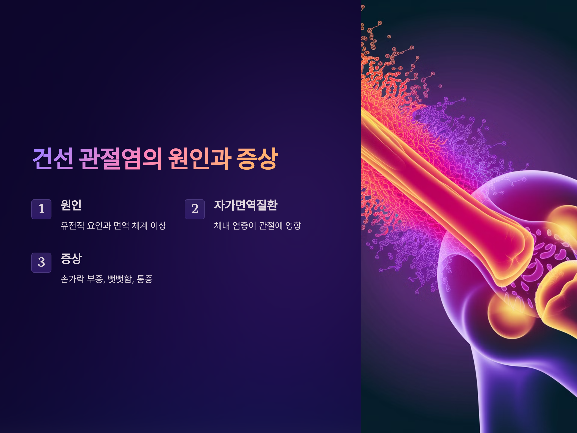 건선 관절염의 정확한 원인은 아직 밝혀지지 않았지만, 유전적인 요인과 면역 체계의 이상이 주요 원인으로 작용하는 것으로 알려져 있습니다. 면역 체계가 자신을 공격하는 자가 면역 질환의 일종이기 때문에, 체내 염증이 관절에 영향을 미쳐 붓기와 통증을 유발합니다.