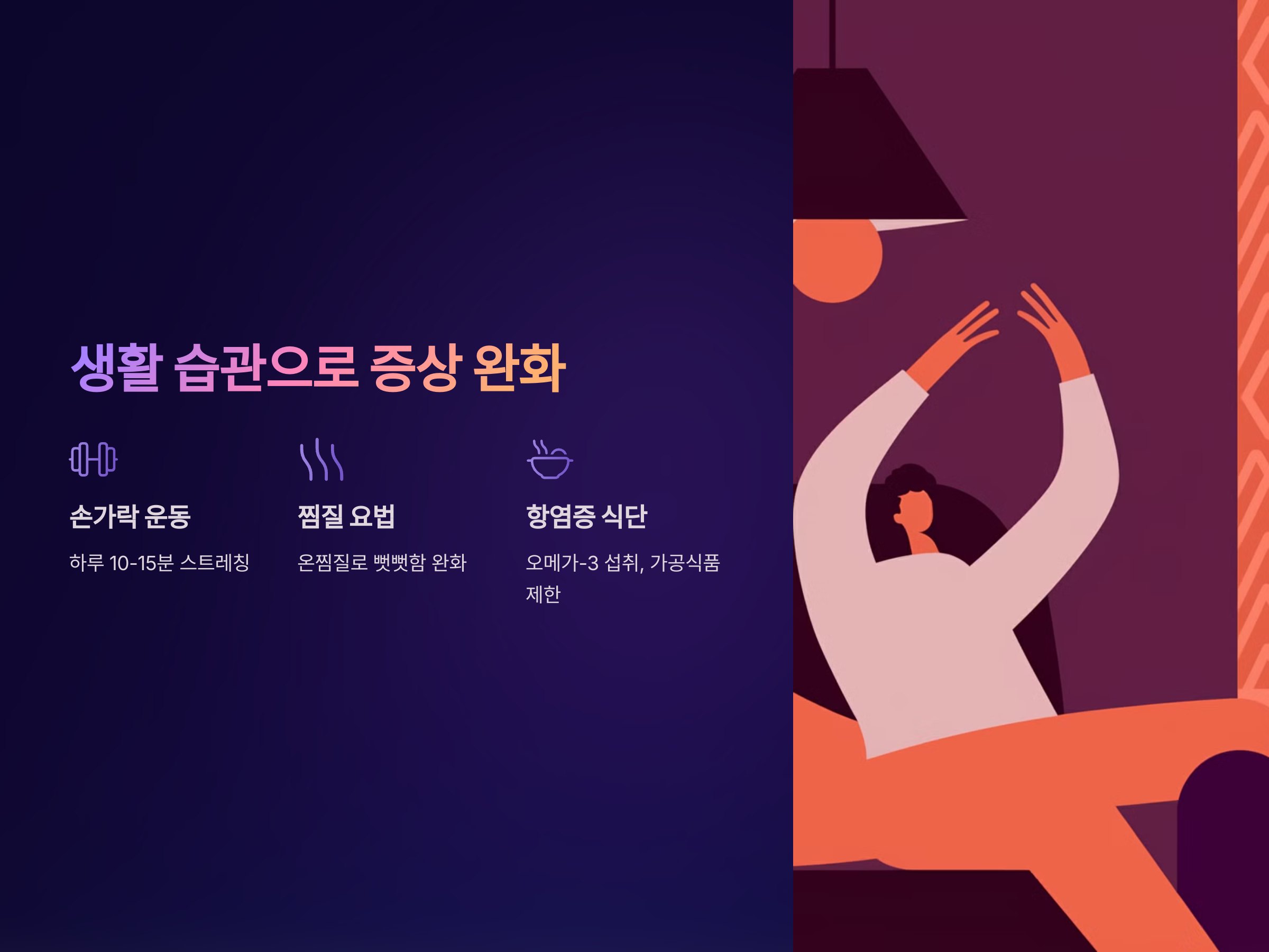 간단한 손가락 스트레칭과 운동은 부종과 뻣뻣함을 완화하는 데 매우 효과적입니다. 손가락을 펼치고 오므리는 운동이나, 손목을 부드럽게 돌리는 운동을 규칙적으로 하면 관절의 유연성이 좋아집니다. 운동은 하루에 10~15분 정도만 해도 도움이 됩니다.