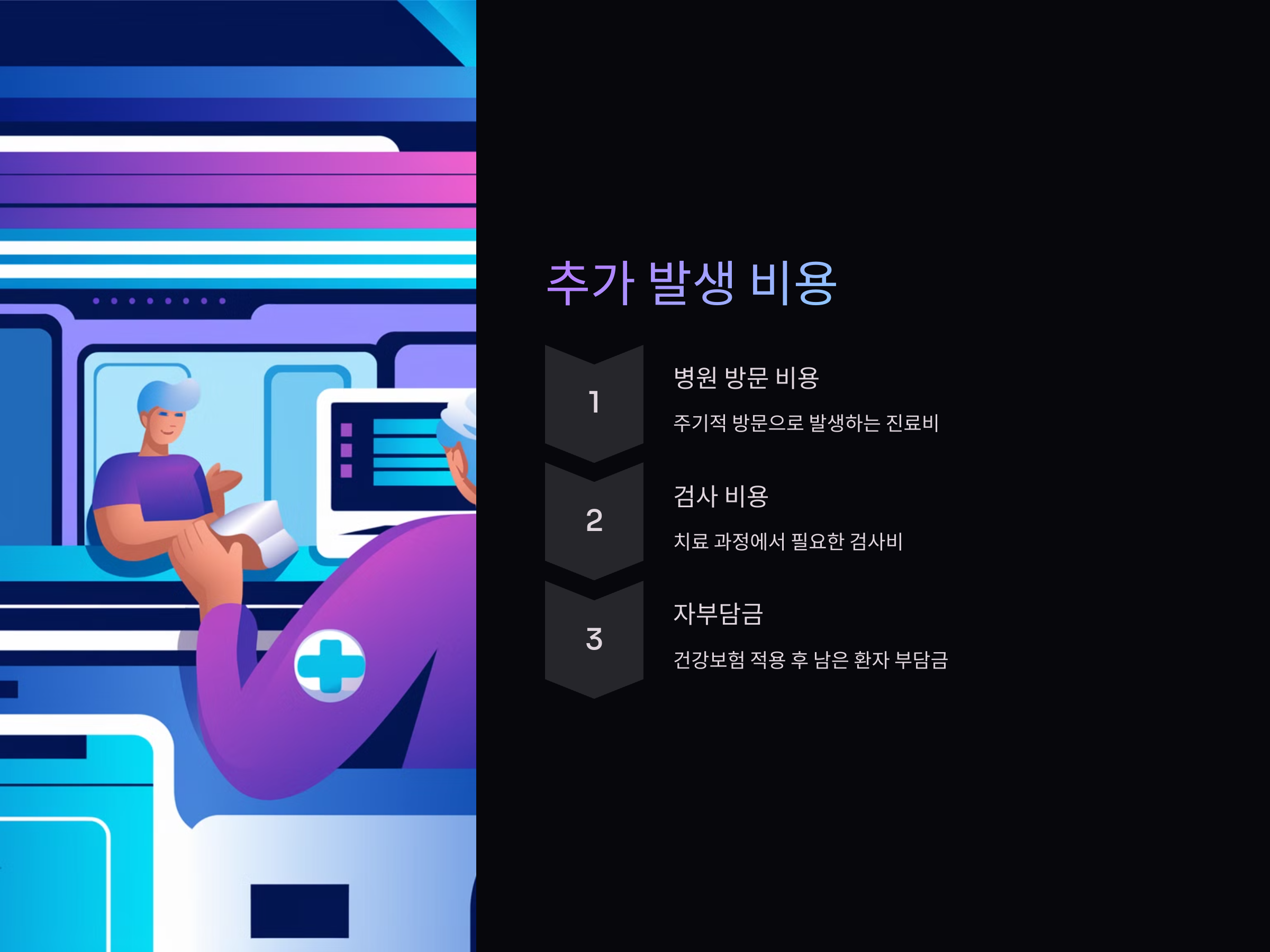 생물학적 제제의 치료비 외에도, 환자들이 주의해야 할 부분은 치료와 관련된 부가적인 비용입니다. 이 비용은 크게 두 가지로 나눠볼 수 있습니다: