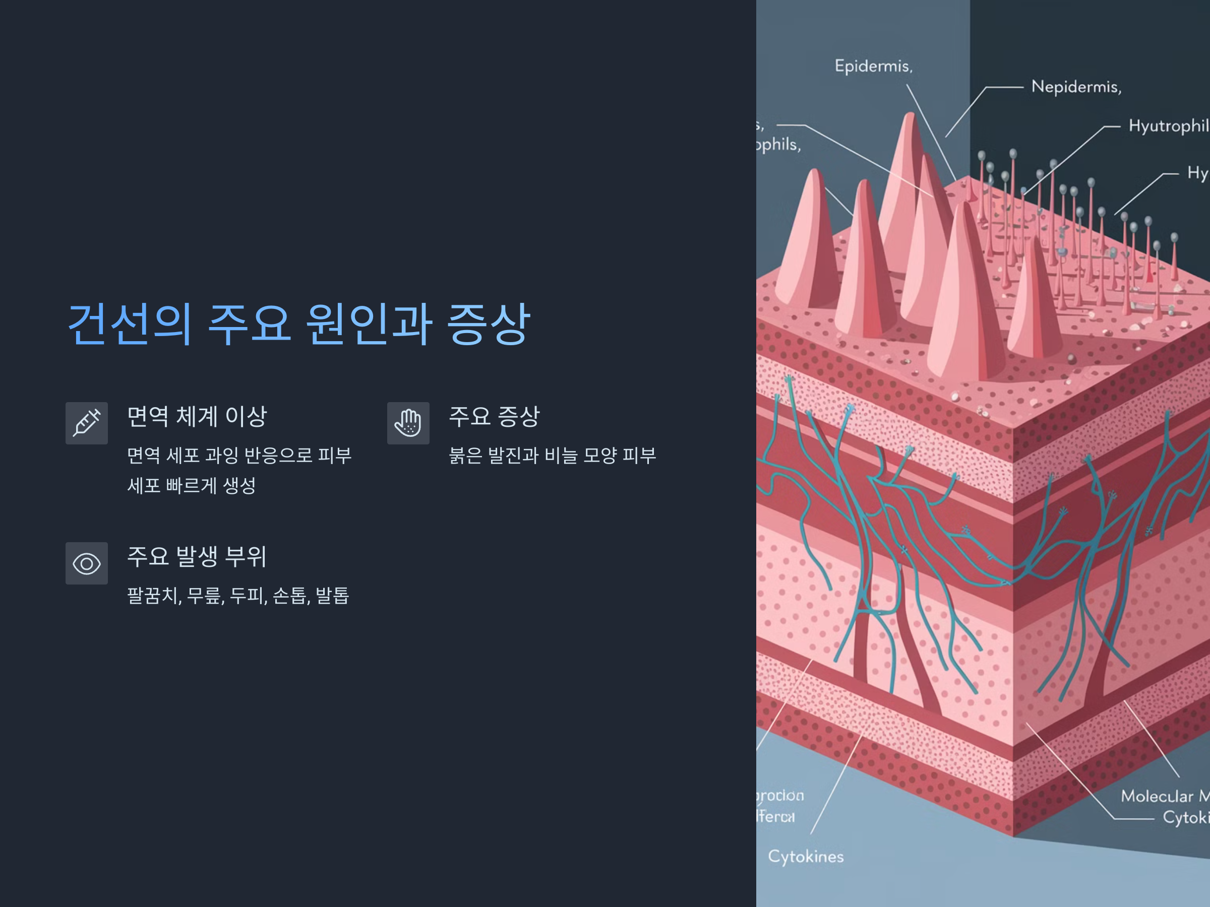 건선의 정확한 원인은 아직까지 명확하게 밝혀지지 않았지만, 주로 면역 체계의 이상 반응이 원인으로 꼽힙니다. 면역 세포가 과잉 반응하여 피부 세포가 정상보다 빠르게 생성되고 이로 인해 피부의 비늘이 두꺼워지고 염증이 생깁니다. 이러한 상태는 대개 팔꿈치, 무릎, 두피, 손톱, 발톱에 가장 많이 나타나며, 다양한 형태로 나타날 수 있습니다. 가장 흔한 증상은 붉고 염증이 있는 발진과 비늘 모양의 피부입니다.