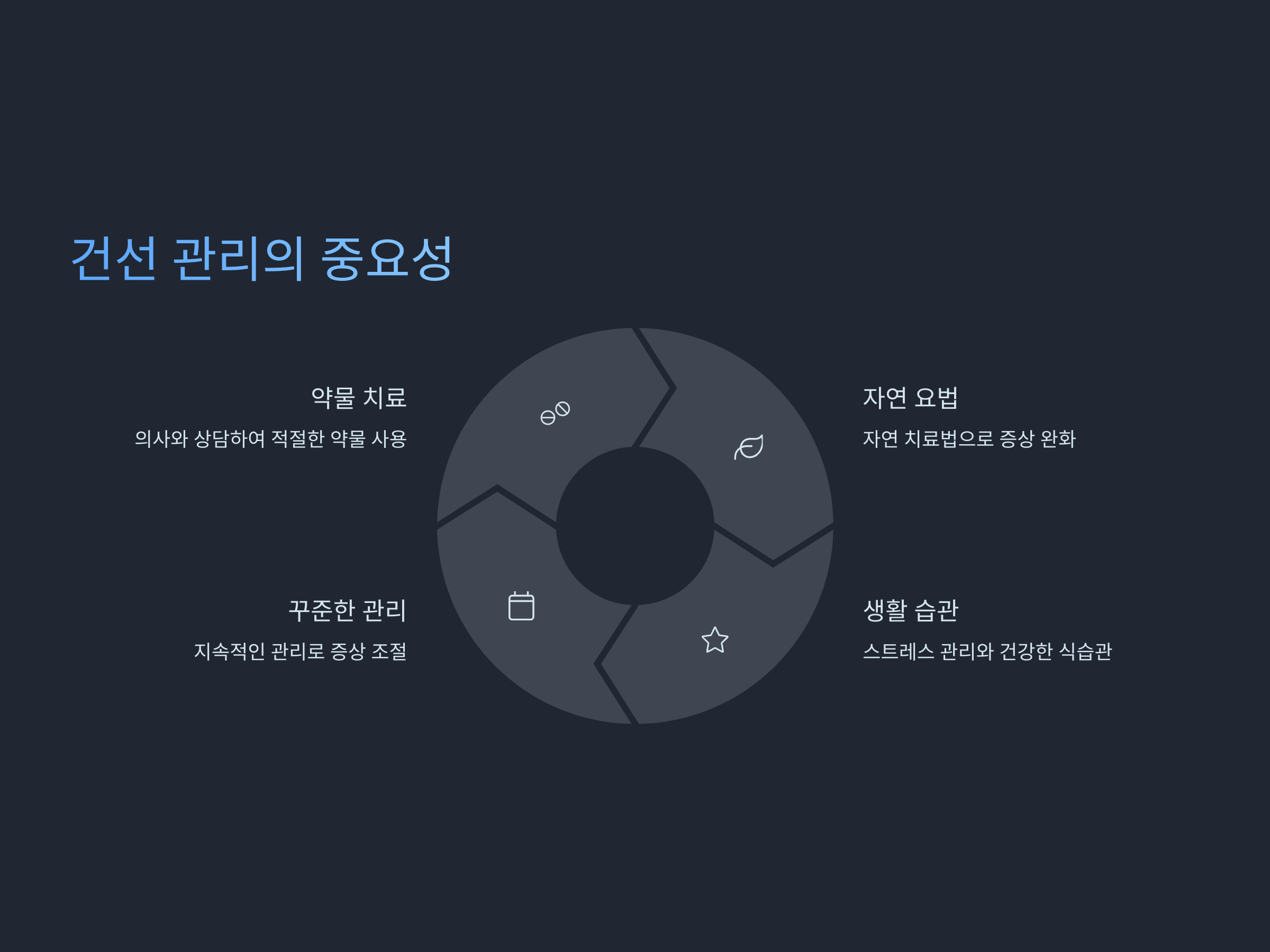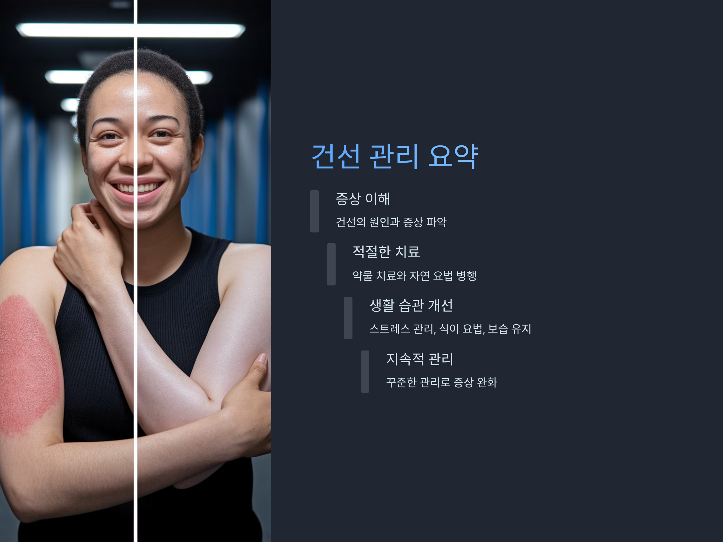 건선은 만성 질환으로, 일상적인 관리가 필수적입니다. 피부 두꺼워짐과 가려움증을 완화하기 위한 약물 치료와 자연적인 방법을 병행하는 것이 효과적입니다. 또한, 생활 습관을 개선하고 스트레스를 관리하는 것도 건선 증상을 완화하는 데 중요한 역할을 합니다. 꾸준한 관리와 치료로 건선 증상을 조절하며 보다 나은 삶을 살 수 있습니다. 건선에 대한 적절한 정보와 치료법을 잘 숙지하고, 개인의 상황에 맞는 방법을 찾는 것이 중요합니다.
