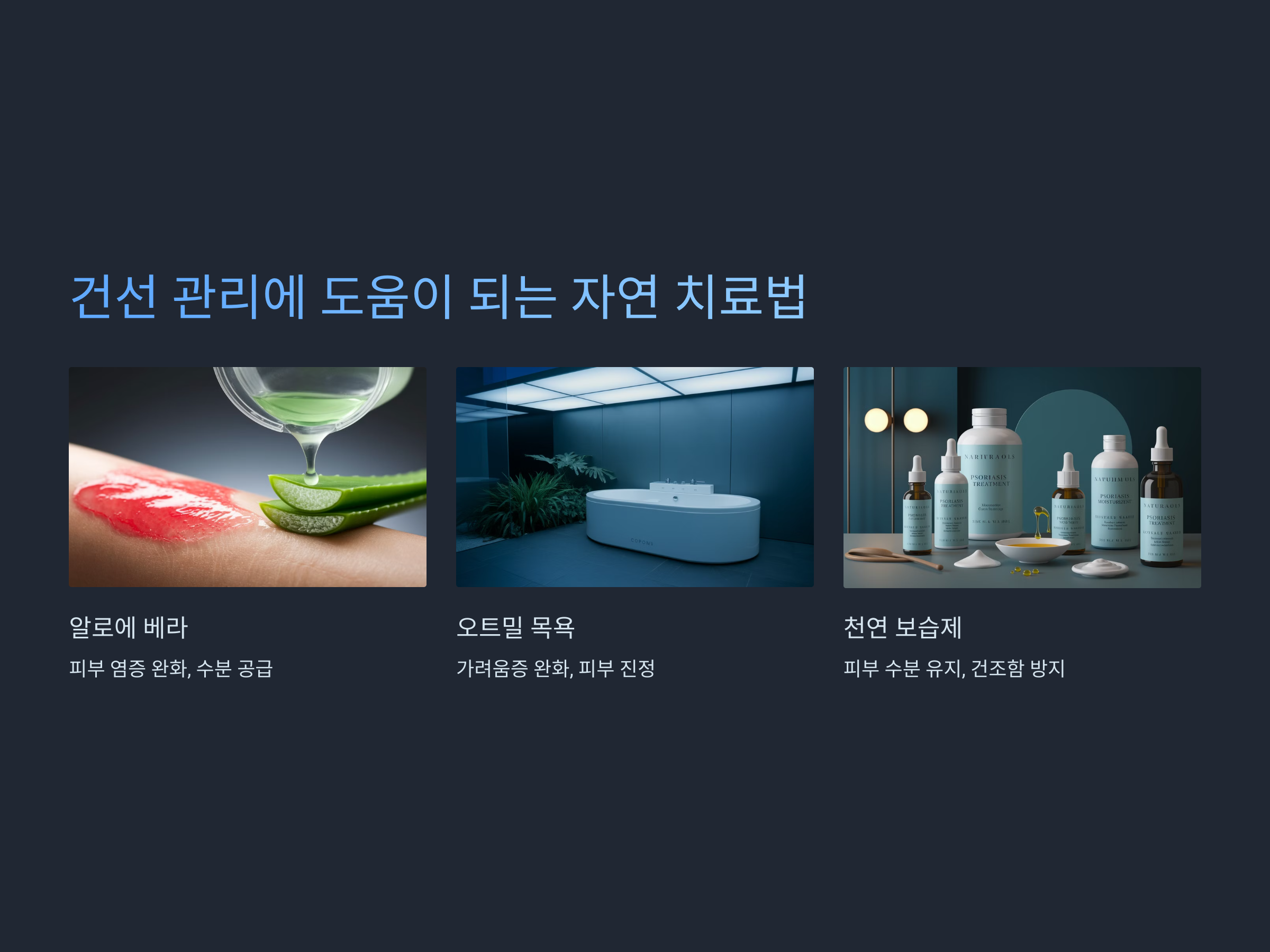 약물 외에도 자연 치료법이 건선 완화에 도움을 줄 수 있습니다. 자연적인 방법은 주로 피부를 진정시키고 염증을 완화하는 데 초점을 맞춥니다.