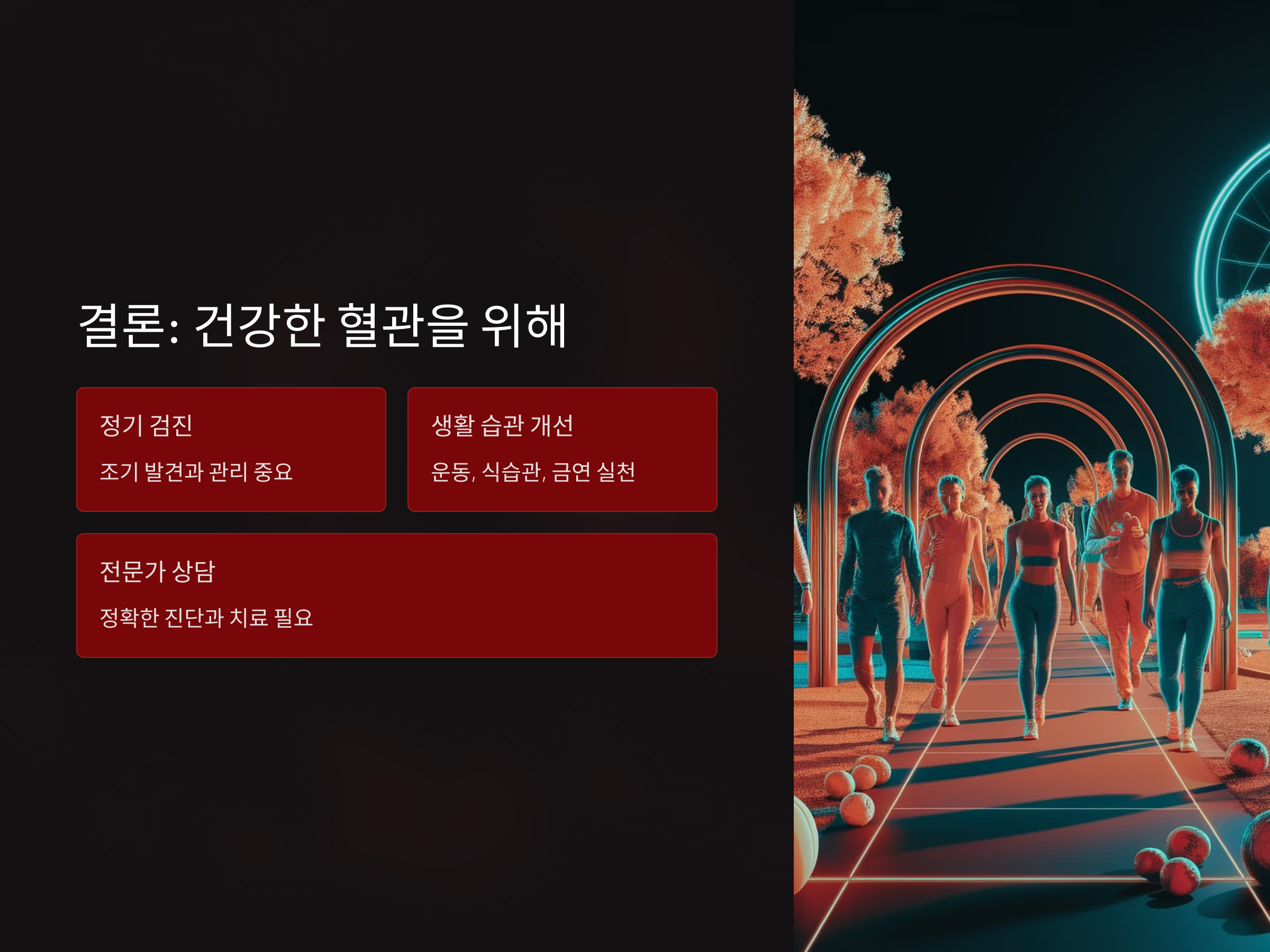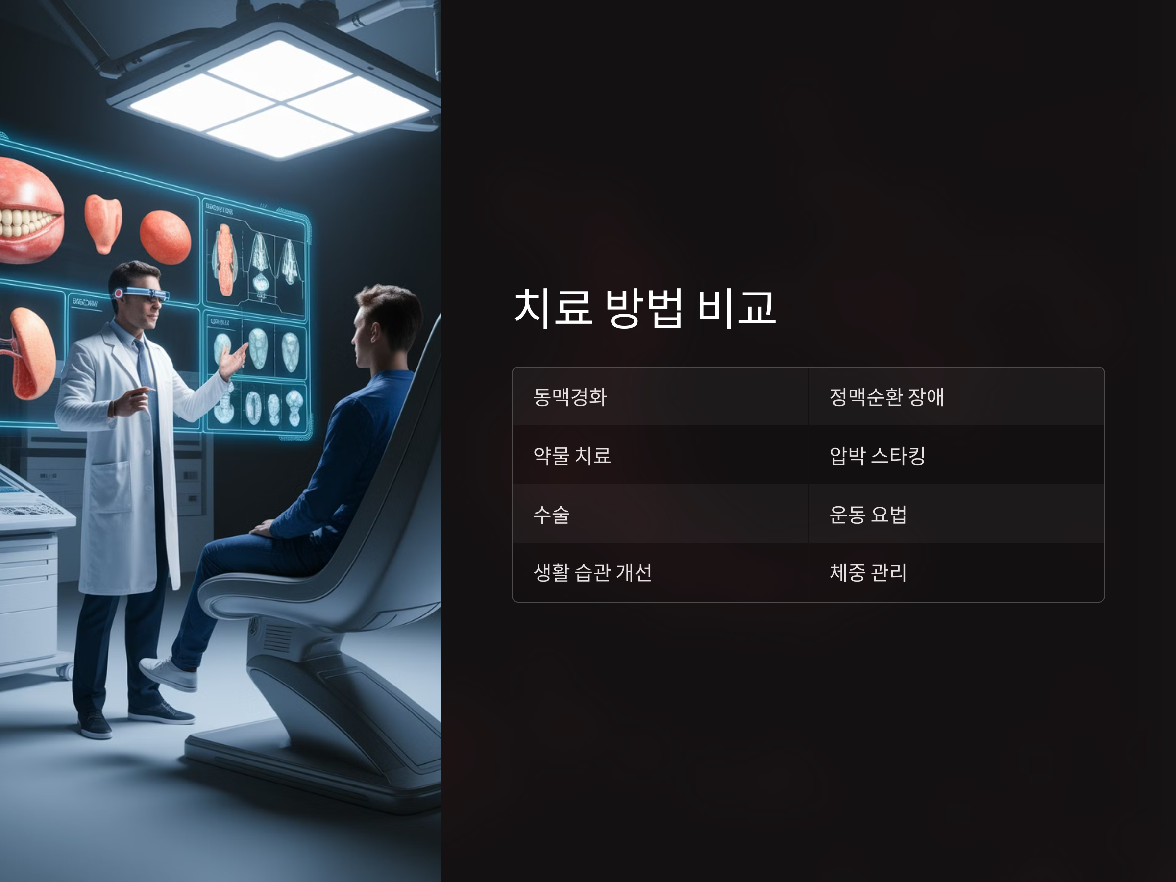 동맥경화는 완치보다는 증상 관리와 진행을 막는 것이 중요합니다. 약물 치료와 생활 습관 개선으로 진행을 늦출 수 있습니다.