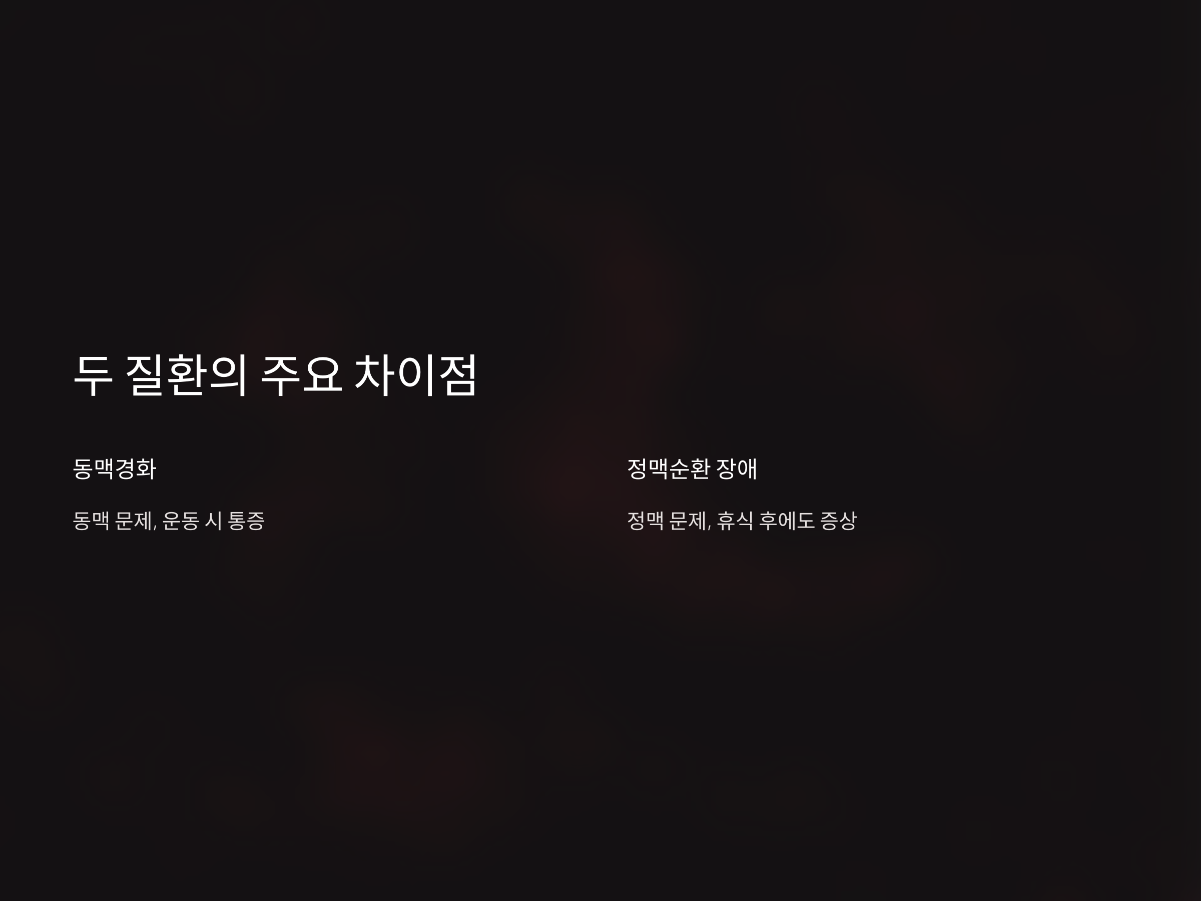 이 두 질환을 구별하는 가장 큰 포인트는 통증의 발생 시점입니다. 동맥경화는 주로 걷거나 운동 중에 통증이 심해지는 반면, 정맥순환 장애는 휴식 후에도 다리가 붓거나 무겁고 통증이 지속됩니다.