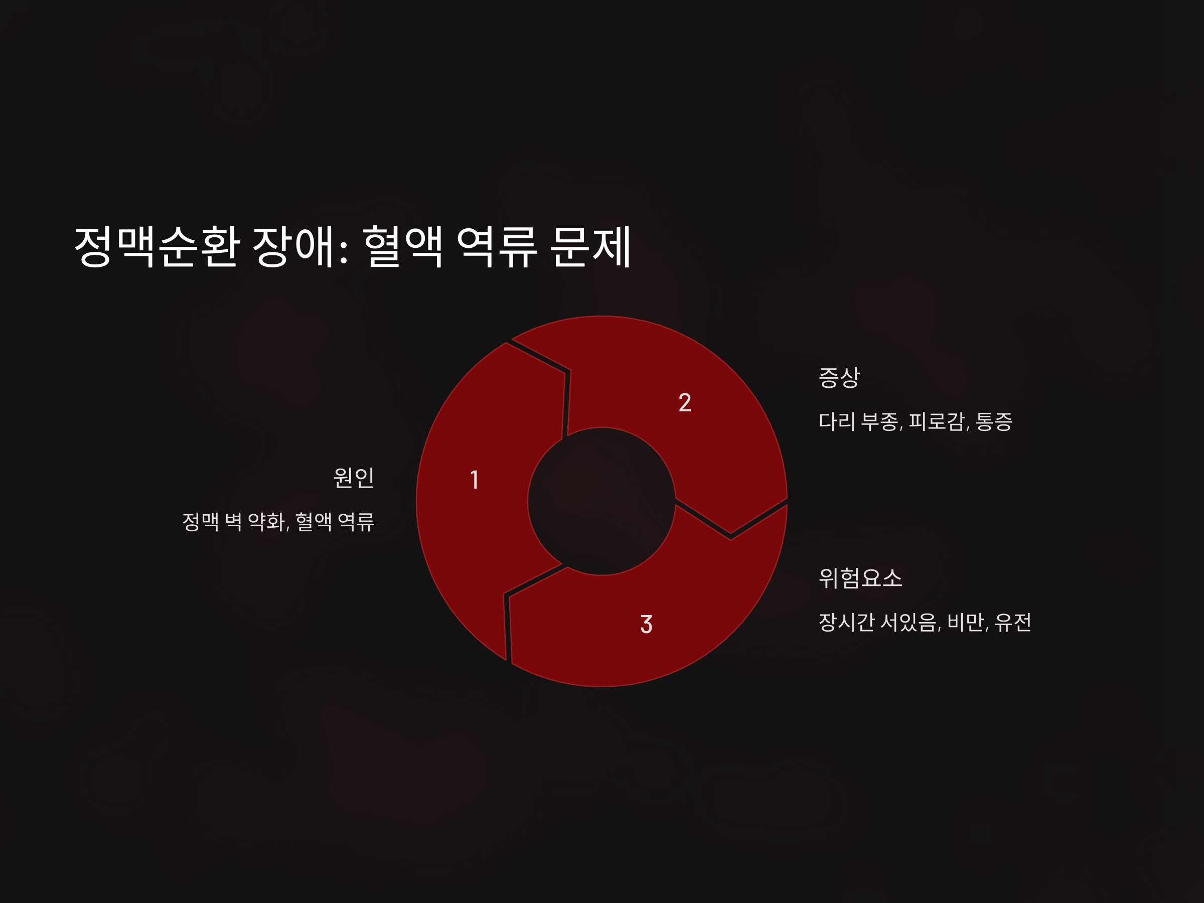 정맥순환 장애는 주로 다리의 정맥에서 발생하는 문제로, 혈액이 역류하거나 정맥 벽이 약해지는 현상으로 나타납니다. 이로 인해 다리의 혈액이 제대로 순환되지 않고, 종아리 근육에 부담을 주어 부종, 통증, 무거움 등의 증상이 발생할 수 있습니다. 주로 장시간 서 있거나 앉아 있는 경우에 문제가 발생하는 경향이 있습니다.