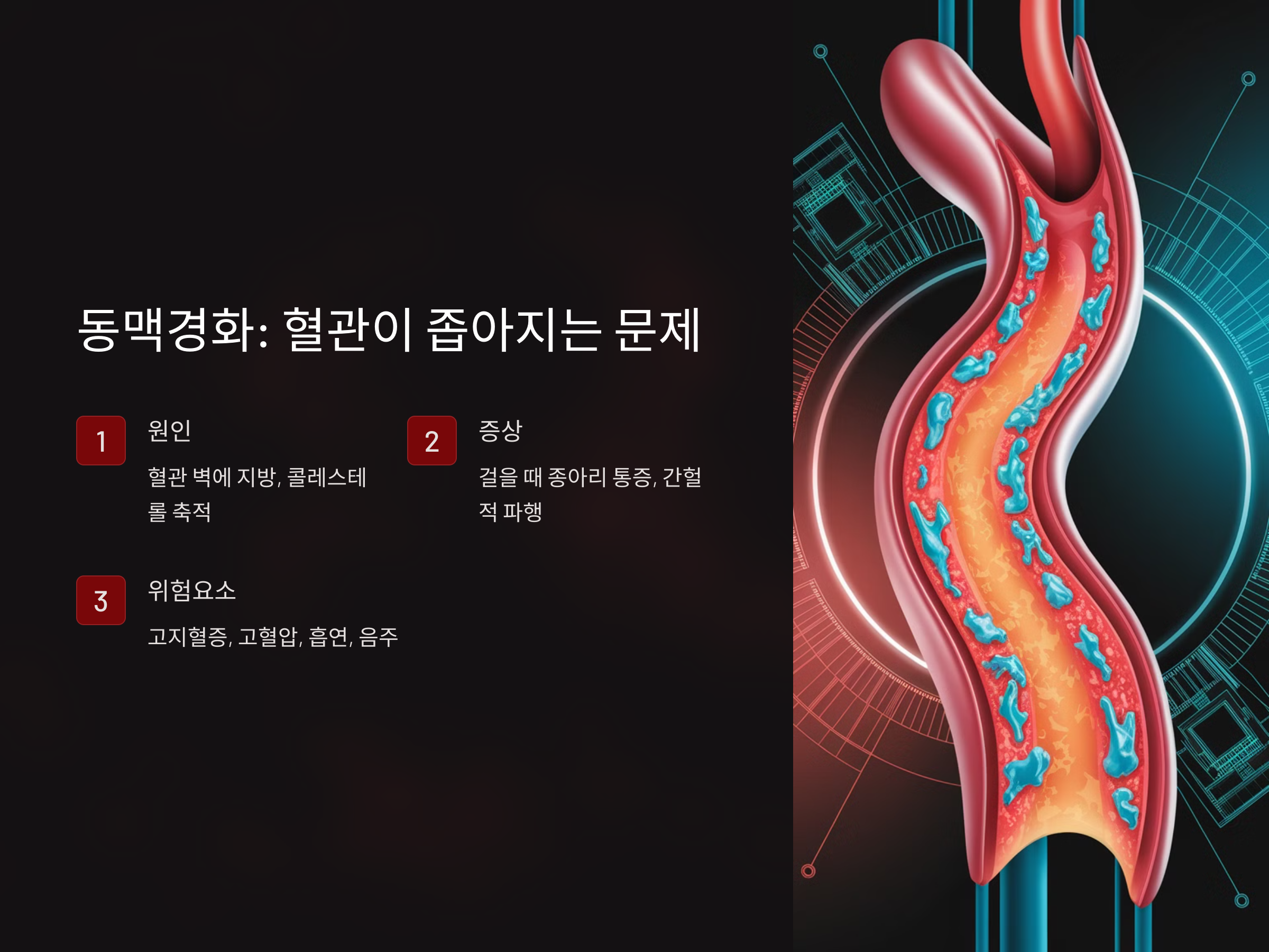 동맥경화는 혈관 벽에 지방, 콜레스테롤, 기타 물질이 축적되어 혈관이 좁아지고 경직되는 질환입니다. 이로 인해 혈액이 원활하게 흐르지 않게 되어, 특히 다리에서 혈액 공급이 부족해질 수 있습니다. 걷거나 운동할 때 종아리 통증이나 절임을 느낄 수 있으며, 이를 간헐적 파행이라고 합니다. 이는 동맥이 좁아져 혈액순환이 제대로 이루어지지 않기 때문에 발생하는 증상입니다.