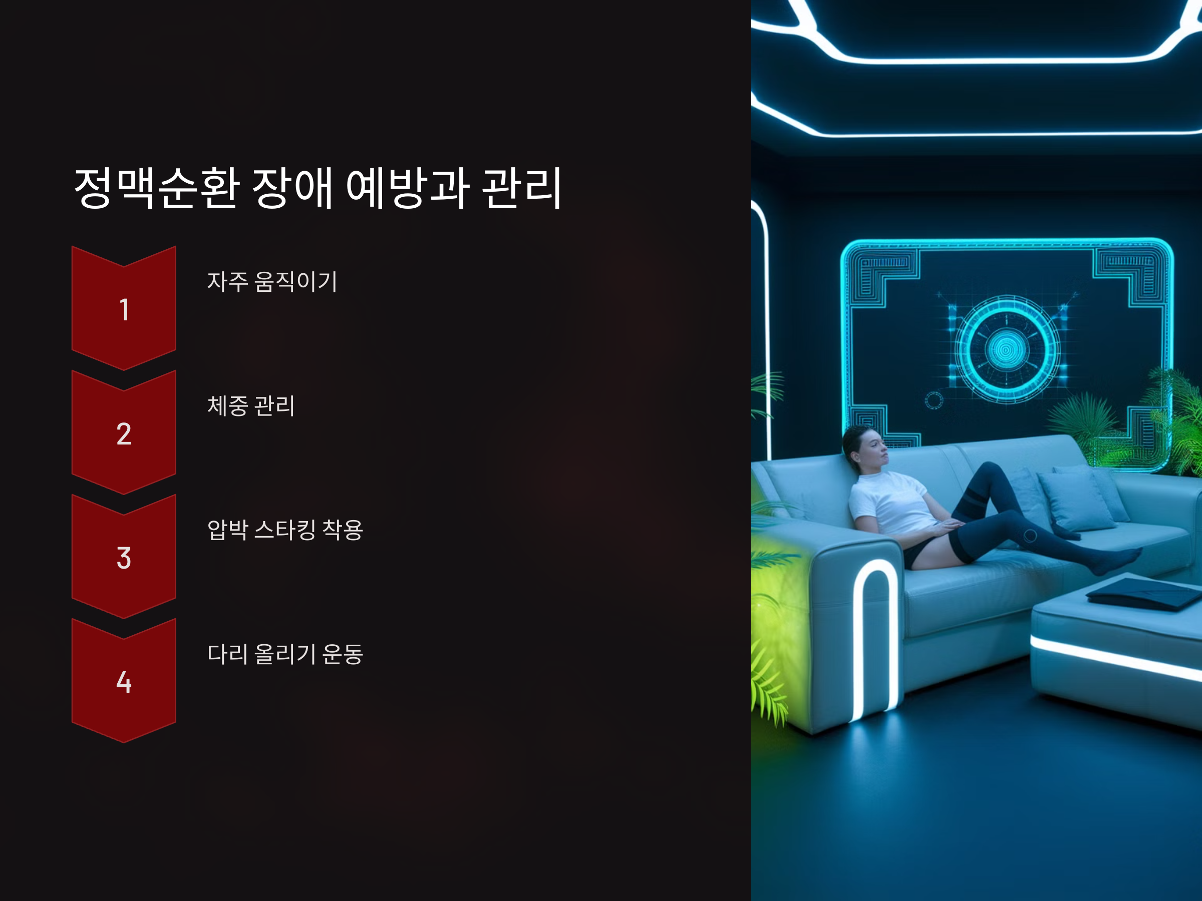 정맥순환 장애는 오래 앉아 있거나 서 있는 시간을 줄이고, 자주 다리를 움직여 혈액순환을 돕는 것이 중요합니다. 또한, 체중을 관리하고, 압박 스타킹을 착용하는 것도 도움이 됩니다. 다리 올리기와 같은 간단한 운동도 순환을 개선하는 데 효과적입니다.