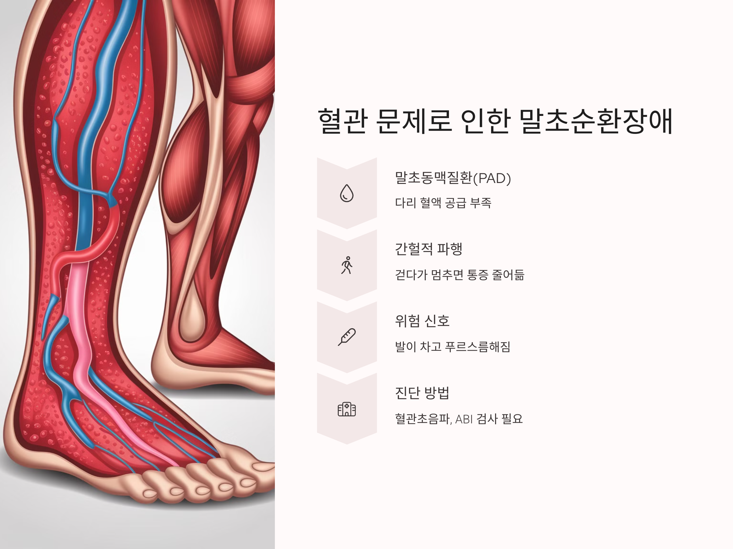 혈관성 문제, 특히 말초동맥질환(PAD)은 다리에 혈액 공급이 원활하지 않아서 통증이나 경련, 무감각, 냉감 등이 나타나는 증상을 동반합니다. 이 경우는 전해질 부족과 달리 휴식 시에도 증상이 심해지거나, 걷다가 멈추면 통증이 줄어드는 특징적인 '간헐적 파행'이 나타납니다. 특히 당뇨병, 고혈압, 고지혈증을 앓고 있는 중장년층 이상에서 흔하게 나타나므로 방치하지 말고 정확한 진단을 받아야 합니다.