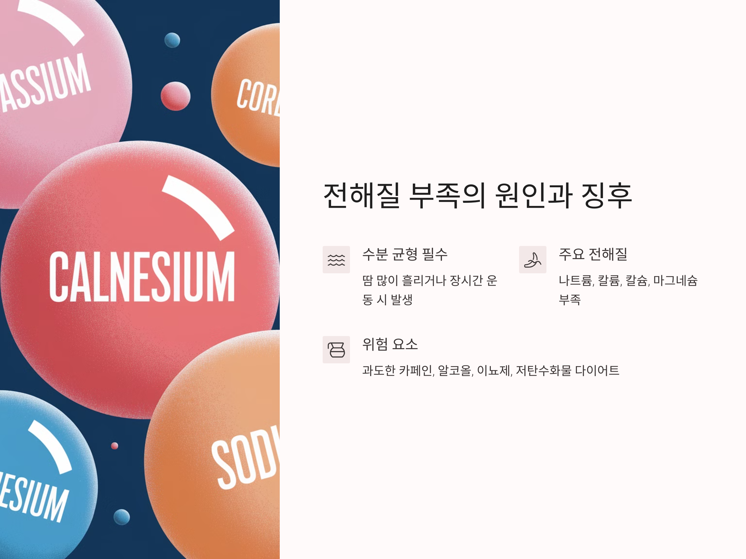 전해질은 우리 몸의 수분 균형과 신경 전달, 근육의 수축에 필수적인 물질로, 대표적으로는 나트륨(Na), 칼륨(K), 칼슘(Ca), 마그네슘(Mg) 등이 있습니다. 이 중 하나라도 부족하게 되면 신체는 다양한 방식으로 경고를 보냅니다. 가장 대표적인 것이 바로 근육경련, 즉 '쥐'입니다. 특히 더운 날씨에 땀을 많이 흘리거나, 장시간 운동을 하거나, 충분한 수분과 전해질을 섭취하지 않았을 경우 이런 증상이 쉽게 나타납니다.