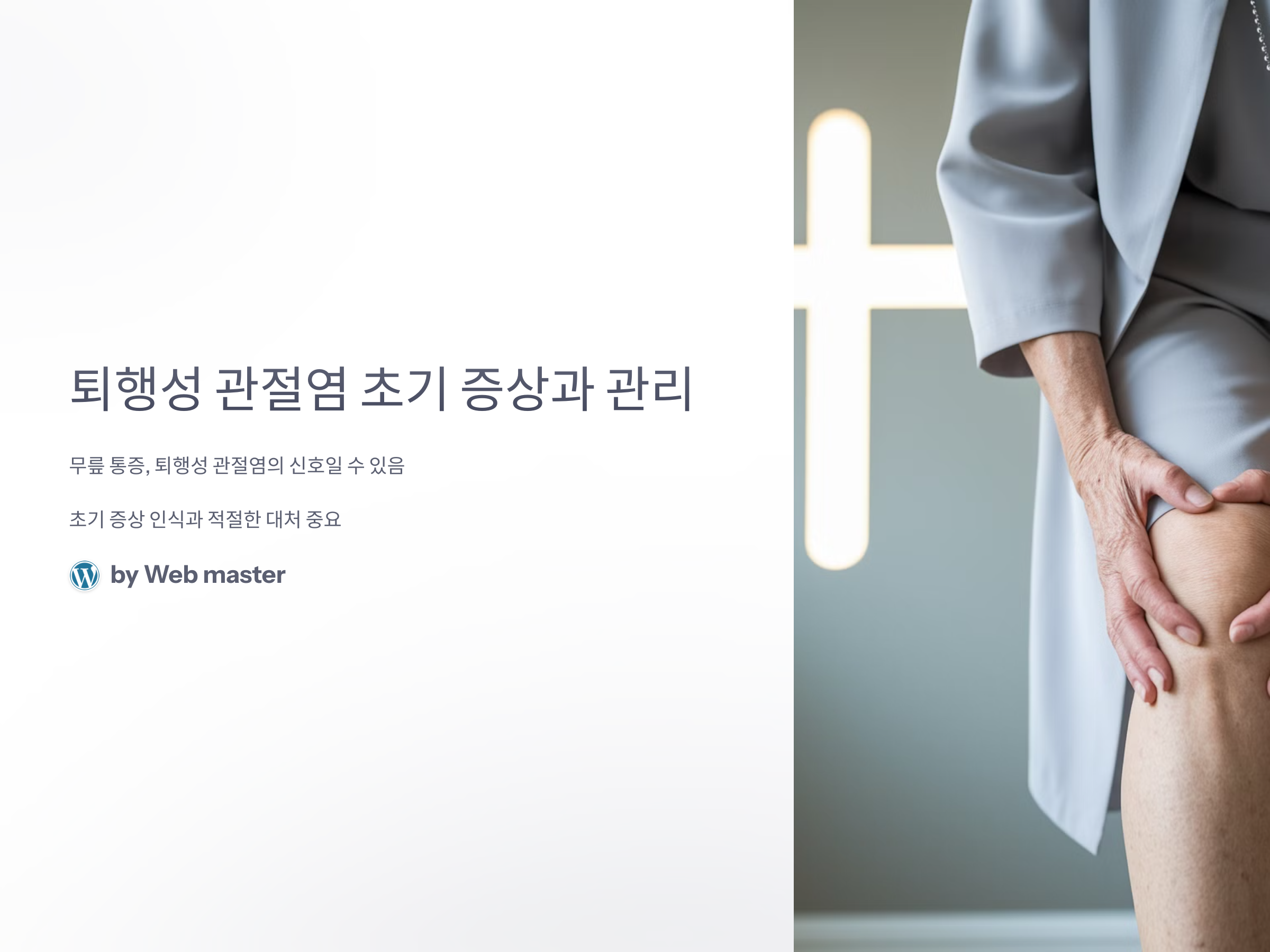 퇴행성 관절염의 초기 증상은 걸을 때 무릎에 찌릿한 통증, 아침에 일어날 때 무릎의 경직, 운동 후 무릎의 붓기 등입니다. 이러한 증상이 반복되면 퇴행성 관절염을 의심해 볼 수 있습니다.