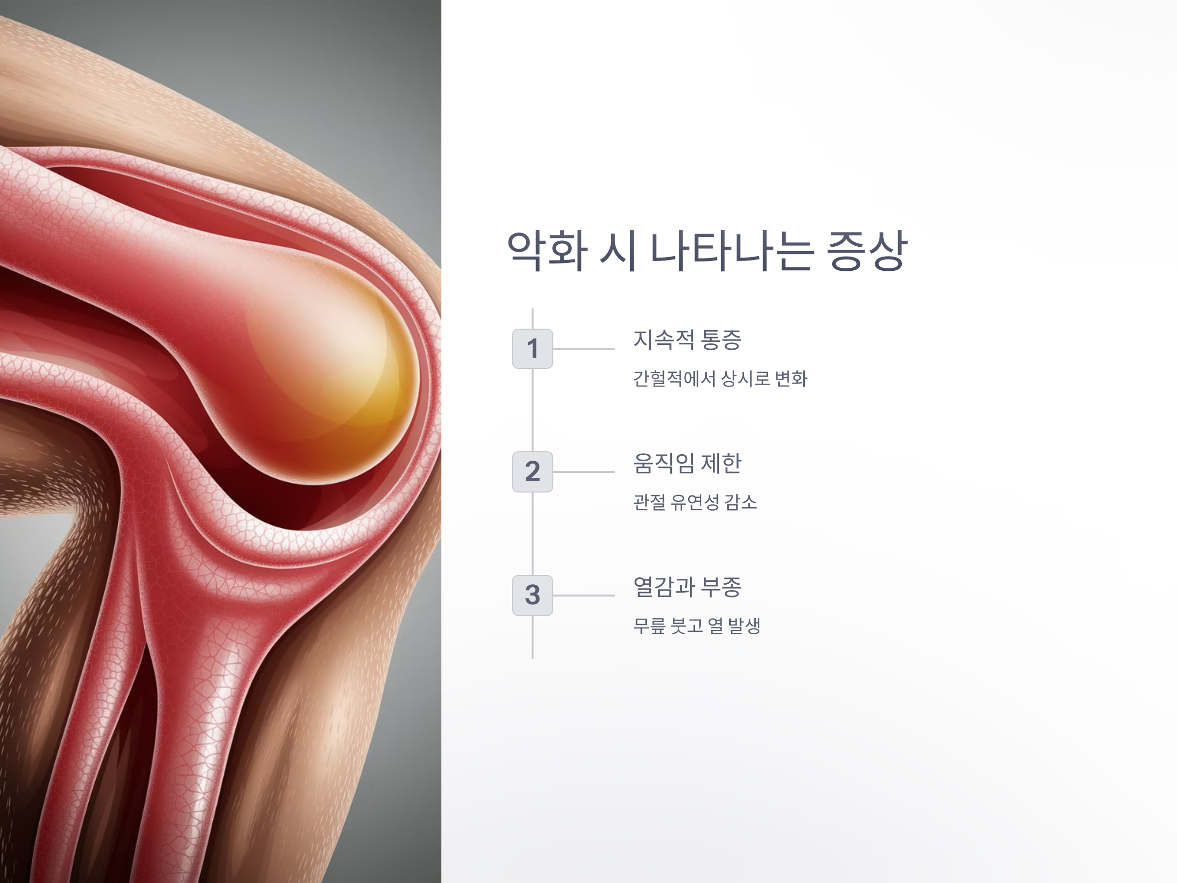 퇴행성 관절염이 악화되면 증상이 더 심해지며, 일상생활에 큰 지장을 줄 수 있습니다. 초기에는 간헐적인 통증에 불과했던 증상이, 시간이 지나면서 지속적인 통증으로 바뀌게 됩니다. 또한, 관절의 움직임이 제한되거나, 무릎이 붓고 열이 나는 등의 증상이 나타날 수 있습니다. 이때는 수술적인 치료가 필요할 수도 있으므로, 초기에 적절한 치료를 받는 것이 중요합니다.