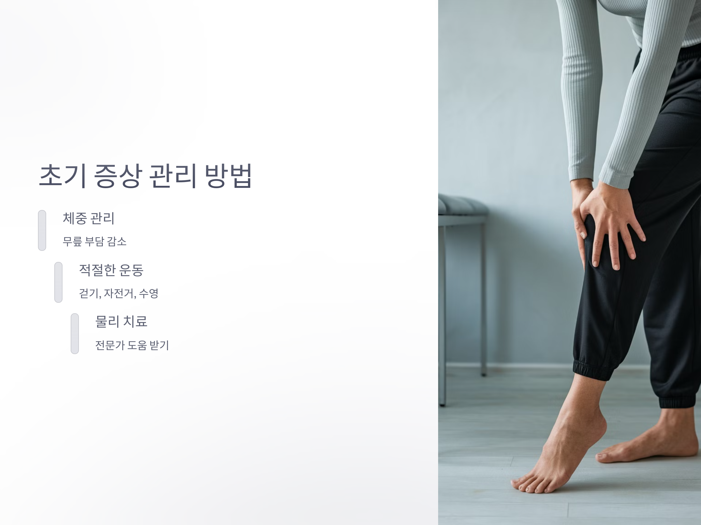 퇴행성 관절염이 초기 단계일 때, 적절한 관리가 중요합니다. 초기에는 관절 연골이 완전히 손상되지 않았기 때문에 증상을 완화하고 질환이 악화되는 것을 방지할 수 있습니다. 다음은 퇴행성 관절염 초기 증상을 관리하는 방법입니다: