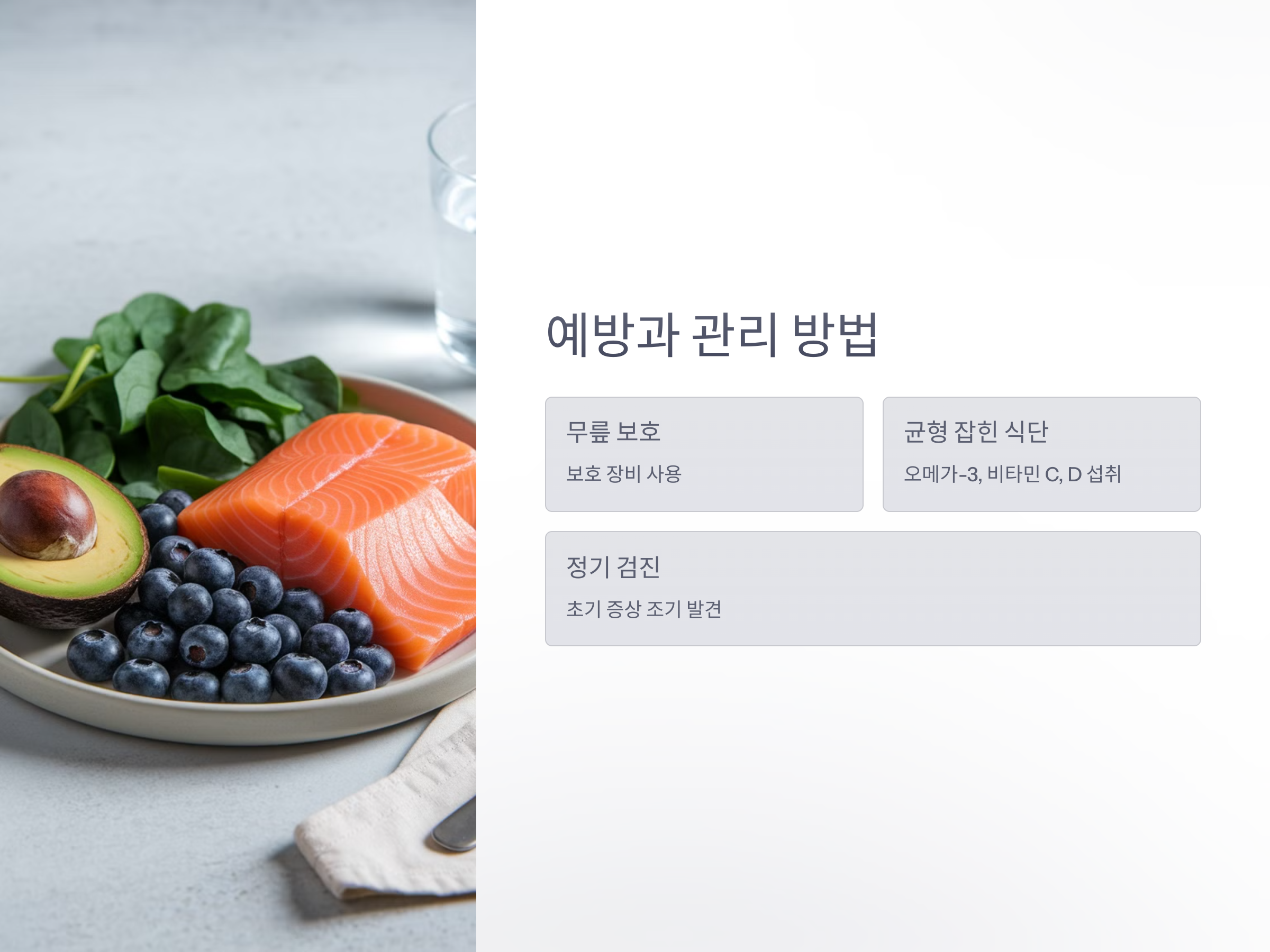 - 운동: 무리하지 않게 꾸준히 운동을 하여 관절을 강화합니다.
