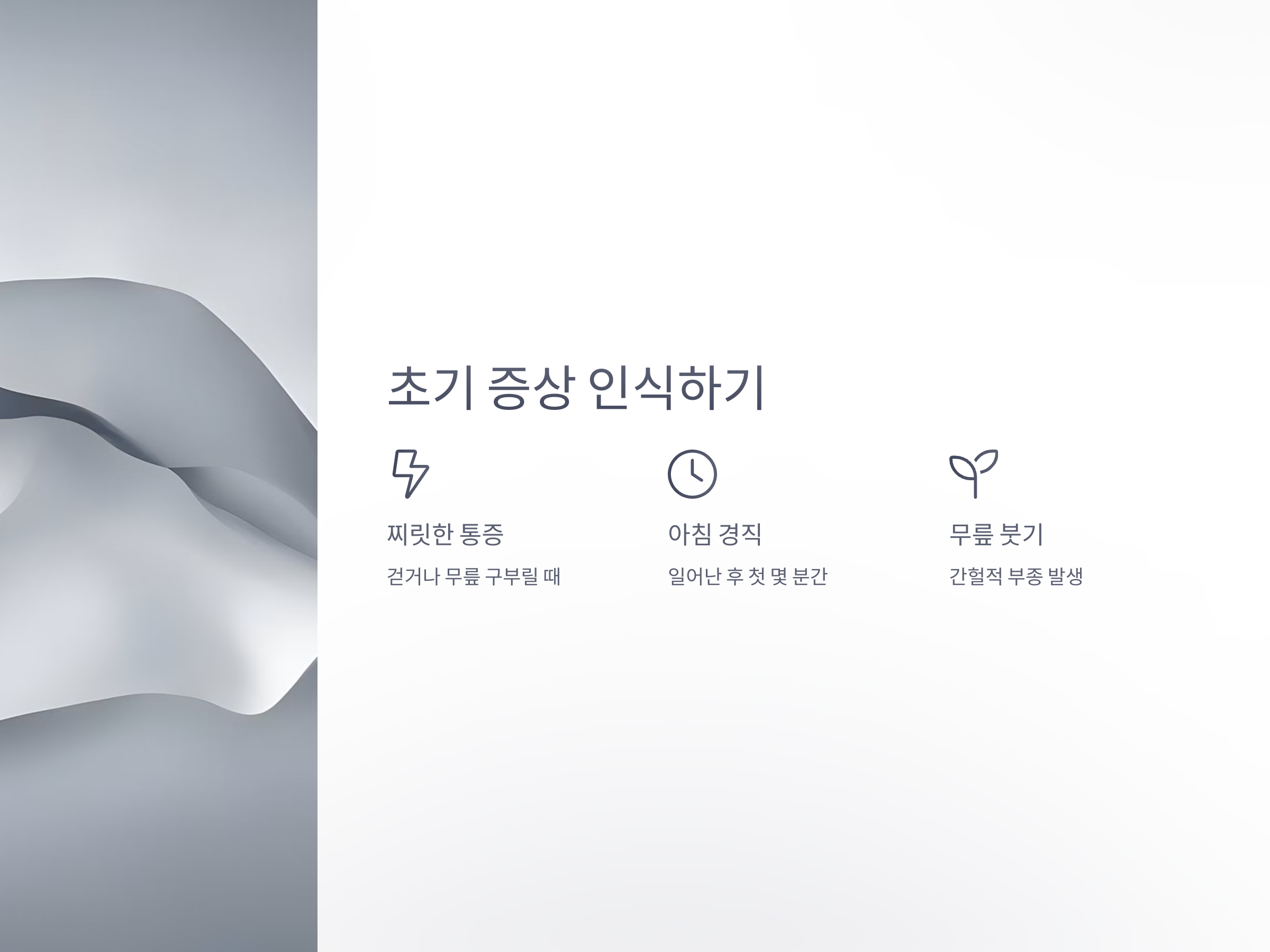 - 아침에 일어났을 때 경직됨: 아침에 일어난 후 첫 몇 분 동안 무릎이 뻣뻣하고 움직이기 힘들 수 있습니다.