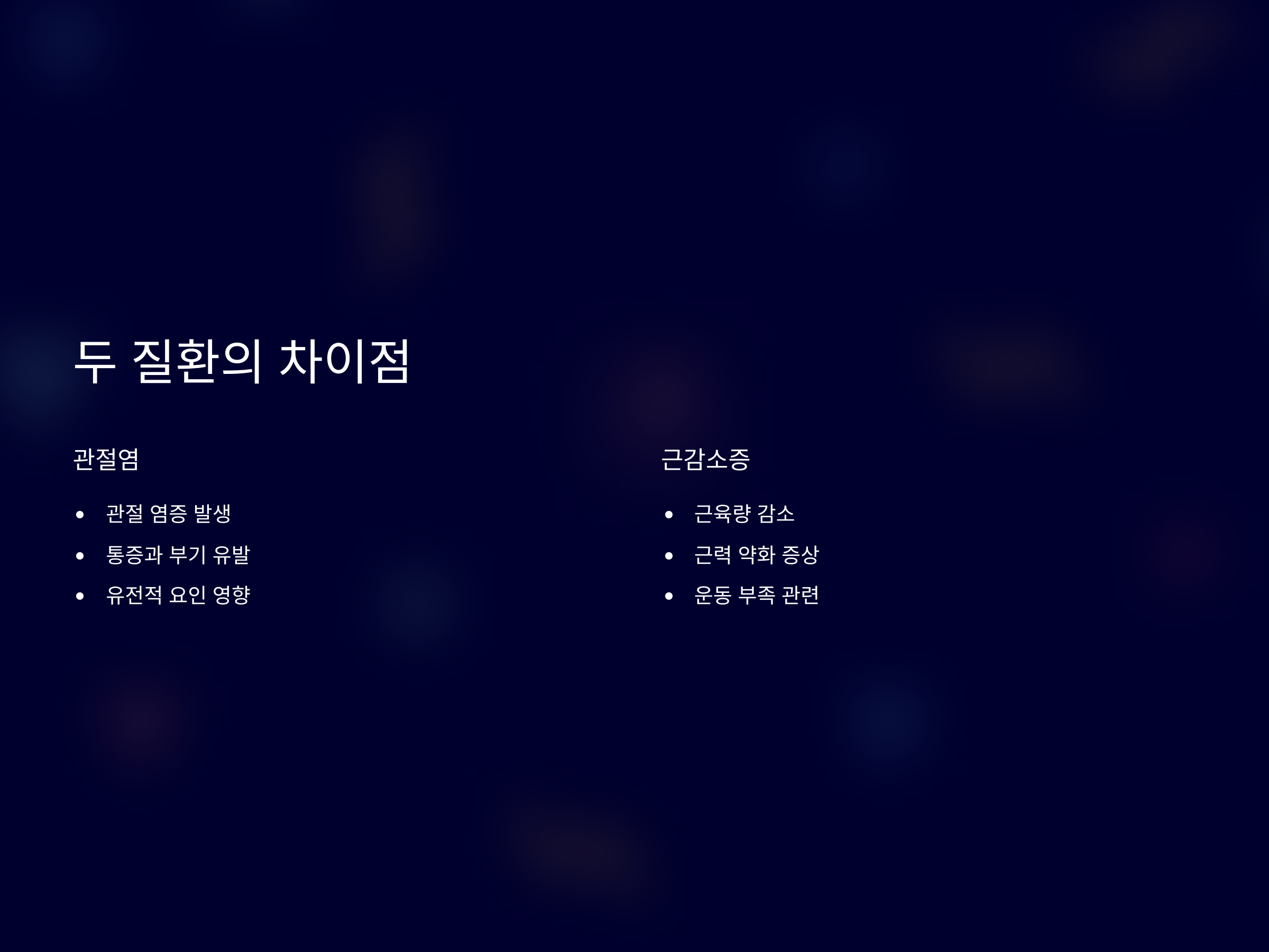 관절염의 경우, 주로 물리 치료나 약물 치료를 통해 통증을 완화시키고 관절의 움직임을 개선하는 방식으로 치료합니다. 근감소증은 근력 운동과 영양 보충을 통해 예방하거나 개선할 수 있습니다. 또한, 두 질환 모두 나이가 들면서 발생할 확률이 높지만, 관절염은 유전적인 요인도 영향을 미치며, 근감소증은 주로 운동 부족과 관련이 깊습니다.