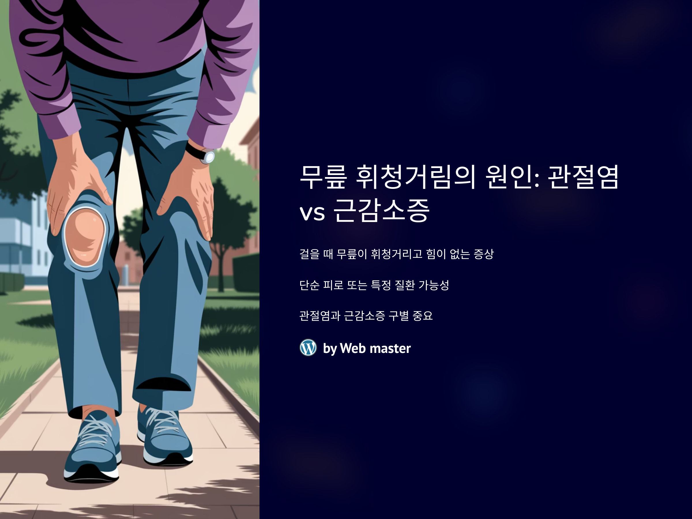 걸을 때 무릎이 휘청거리고 힘이 없다면, 관절염이나 근감소증이 원인일 수 있습니다. 이 두 질환은 증상이 비슷할 수 있으나, 각각의 원인과 치료 방법은 다릅니다. 정확한 진단을 통해 적절한 치료를 받는 것이 중요합니다. 운동 부족과 잘못된 생활 습관이 원인이 될 수 있으므로, 꾸준한 운동과 균형 잡힌 식사를 통해 예방하고 개선할 수 있습니다. 이 글에서 소개한 정보들을 바탕으로, 자신에게 맞는 치료 방법과 생활 습관을 선택하여 건강을 유지할 수 있기를 바랍니다.