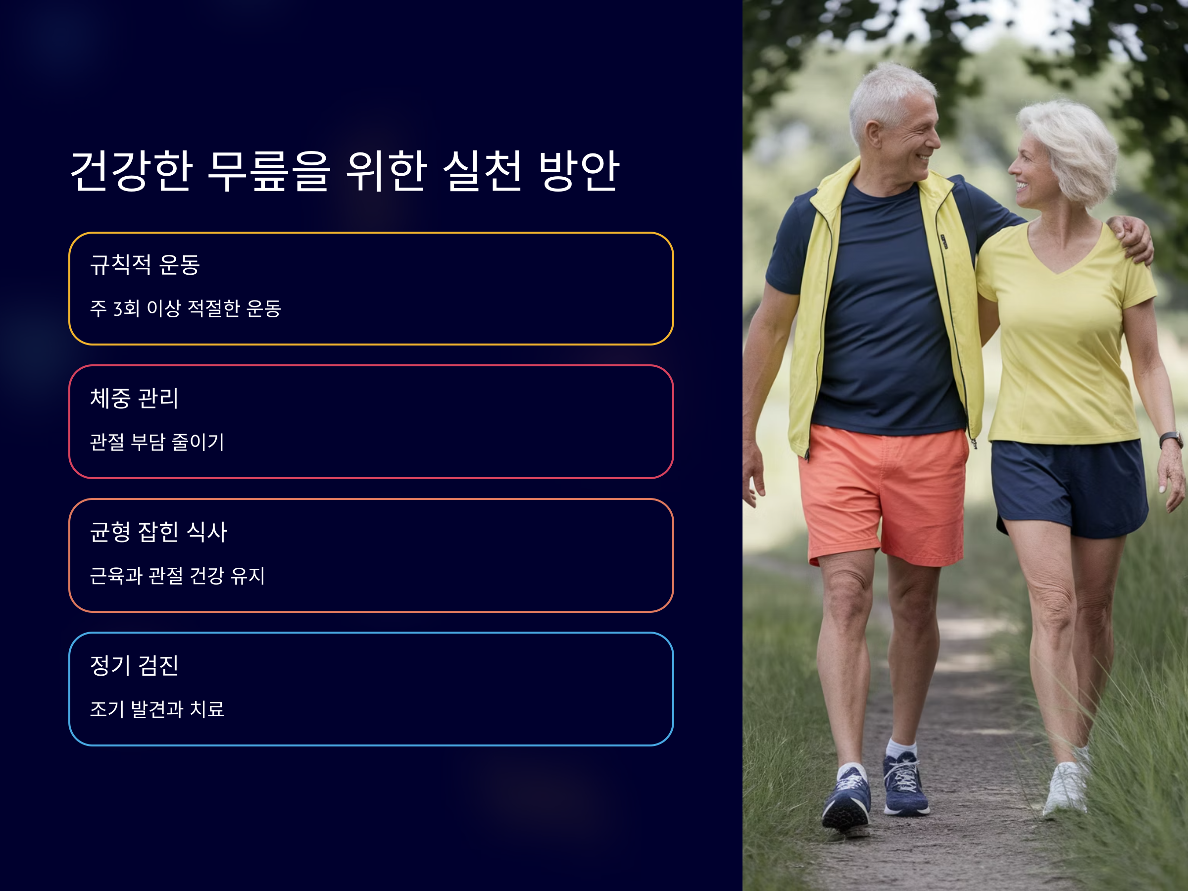 관절염과 근감소증을 예방하기 위해서는 건강한 생활 습관을 유지하는 것이 중요합니다. 꾸준한 운동은 두 질환을 예방하는 데 큰 도움이 됩니다. 관절염 예방을 위해서는 관절에 부담을 주지 않는 운동을 선택하는 것이 좋습니다. 수영이나 자전거 타기와 같은 저충격 운동이 좋습니다.