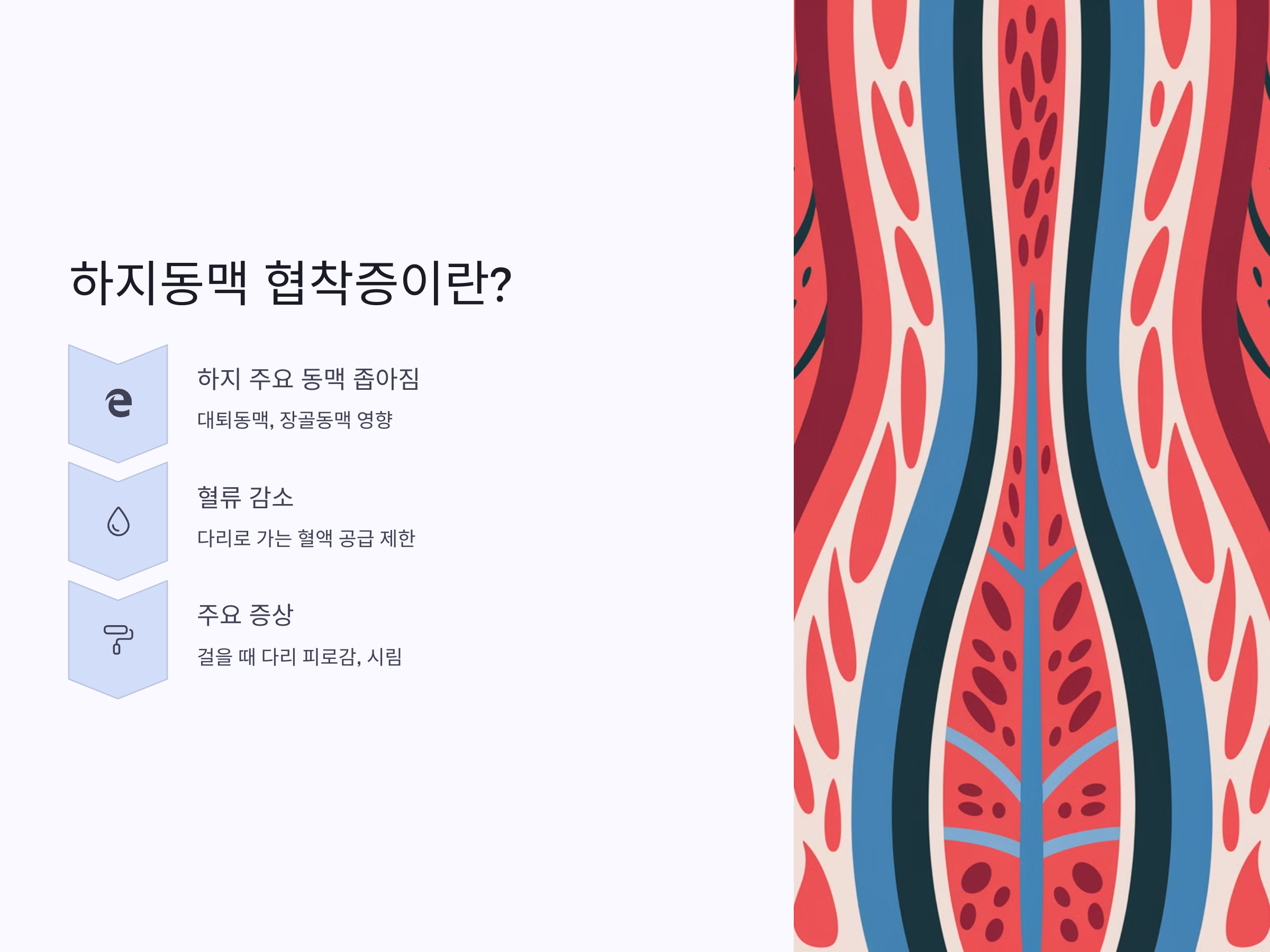 하지동맥 협착증은 하지의 주요 동맥이 좁아져서 혈류가 감소하는 상태입니다. 이 상태는 주로 혈관의 내벽이 손상되거나 그 안에 지방이 쌓이는 것이 원인입니다. 특히 하지동맥 협착증은 다리의 주요 혈관인 대퇴동맥이나 장골동맥에 발생할 수 있으며, 다리로 가는 혈액 공급이 제한되면서 허벅지, 종아리 등에 통증이나 무거움, 시림 등의 증상이 나타납니다.