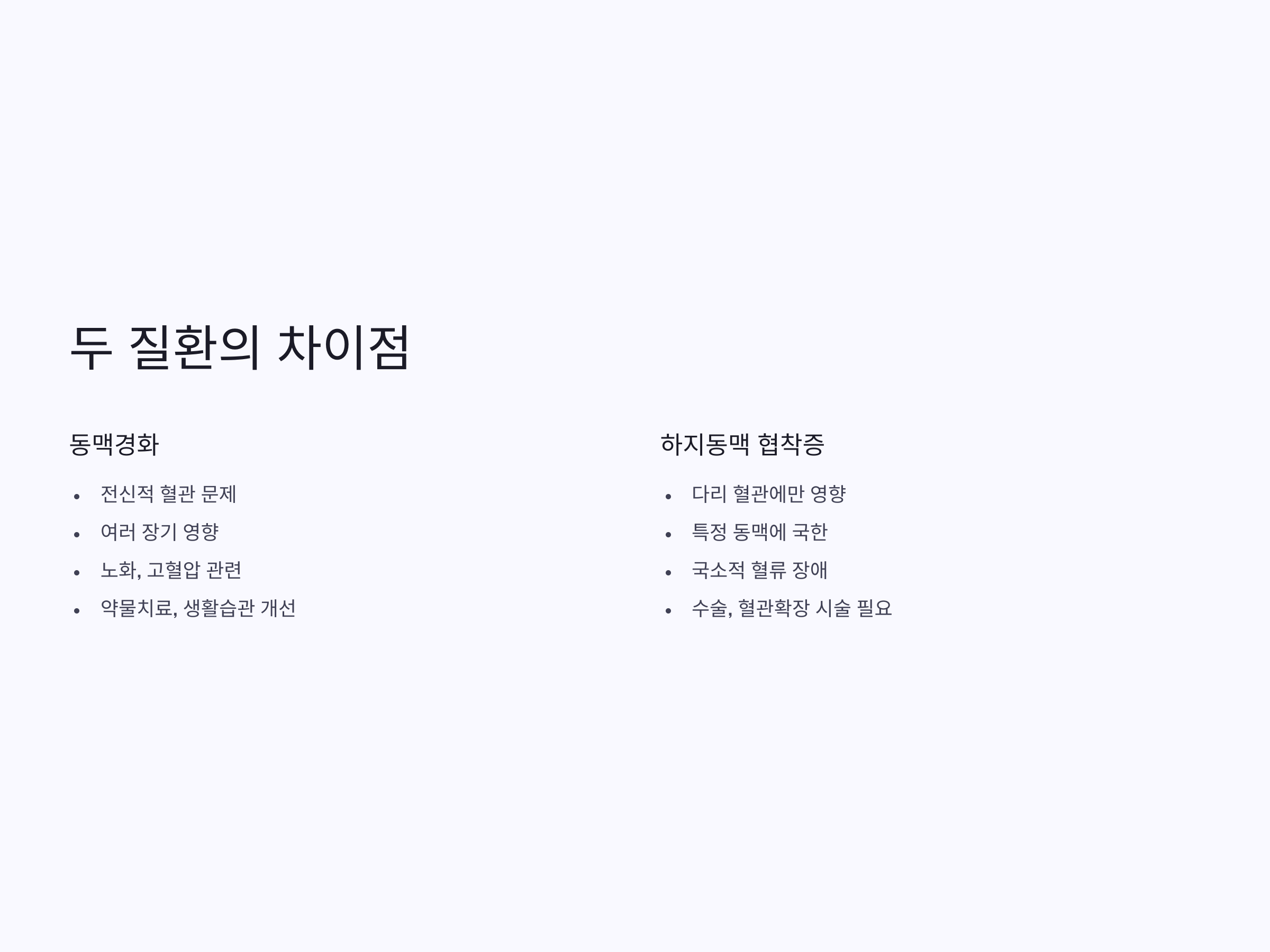동맥경화와 하지동맥 협착증은 비슷한 증상을 보일 수 있지만, 그 발생 원인과 치료 방법에서 차이를 보입니다.