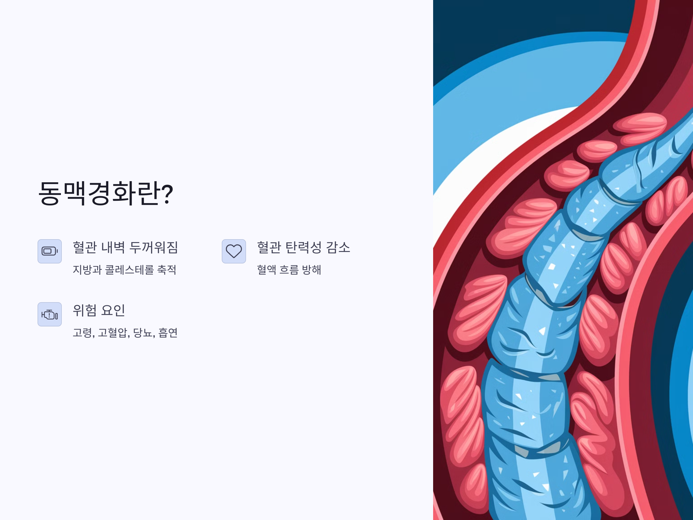 동맥경화는 혈관의 내벽이 두꺼워지고 단단해지는 상태로, 주로 지방과 콜레스테롤이 혈관 벽에 쌓이면서 발생합니다. 이로 인해 혈관이 좁아지고 탄력성이 감소하면서, 혈액이 원활하게 흐르지 못하게 됩니다. 동맥경화는 심혈관계 질환의 주된 원인으로 알려져 있으며, 특히 나이가 많고 고혈압, 당뇨, 흡연 등의 위험 인자가 있을 때 발생 확률이 높습니다.