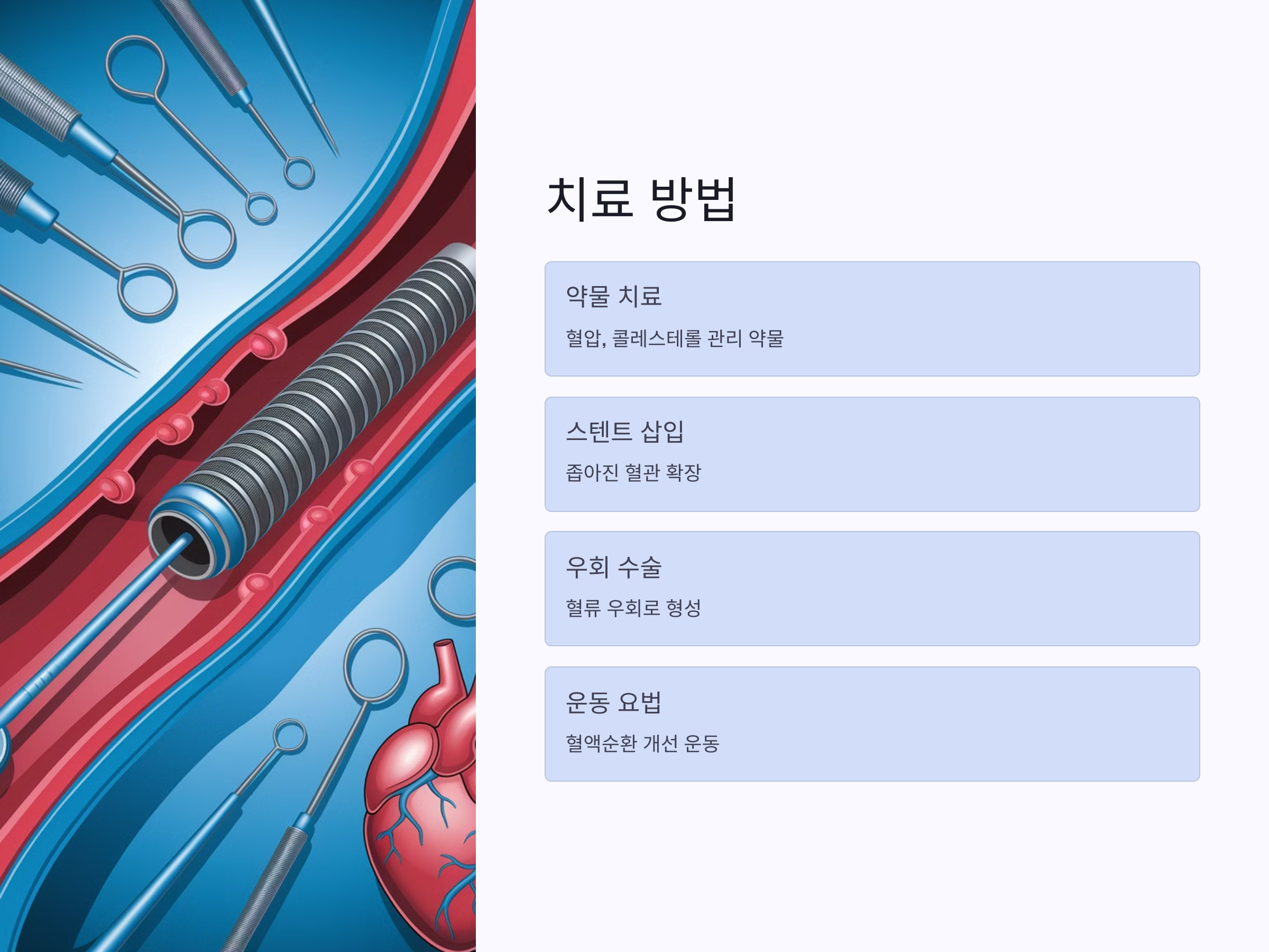 - 동맥경화 치료: 약물 치료와 식습관 개선, 운동 등을 통해 혈압과 콜레스테롤을 관리합니다. 또한 심각한 경우에는 스텐트 삽입이나 우회 수술이 필요할 수 있습니다.