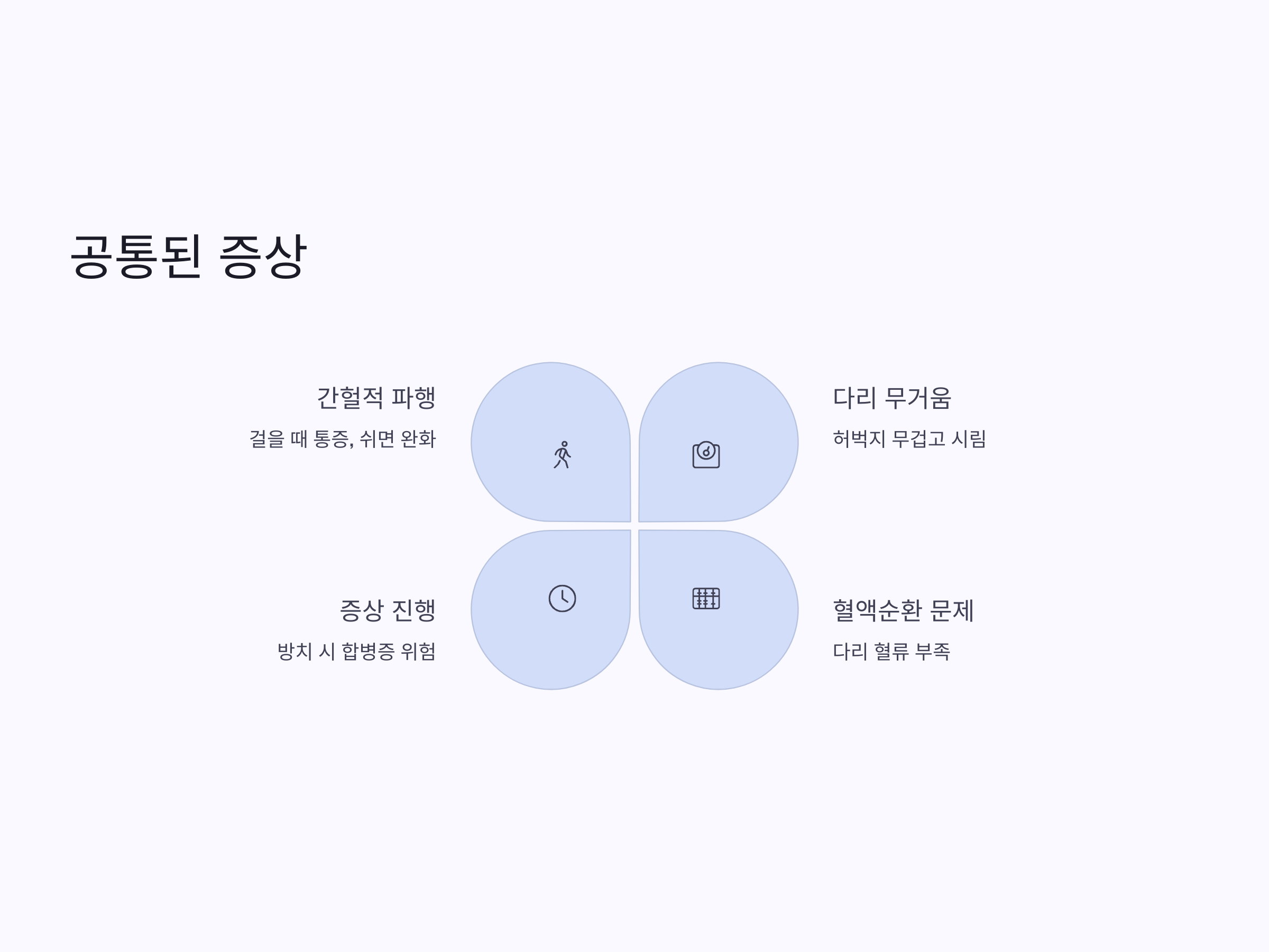 두 질환은 공통적으로 혈액순환이 원활하지 않게 되어, 다리의 통증과 불편함을 유발합니다. 특히 걸을 때 허벅지가 무겁고 시린 증상은 공통적인 특징으로, 간헐적 파행을 겪는 경우가 많습니다. 이는 걷는 동안 다리로의 혈류가 부족해지며 발생하는 증상으로, 일시적으로 멈추고 나면 통증이 완화되기도 합니다.