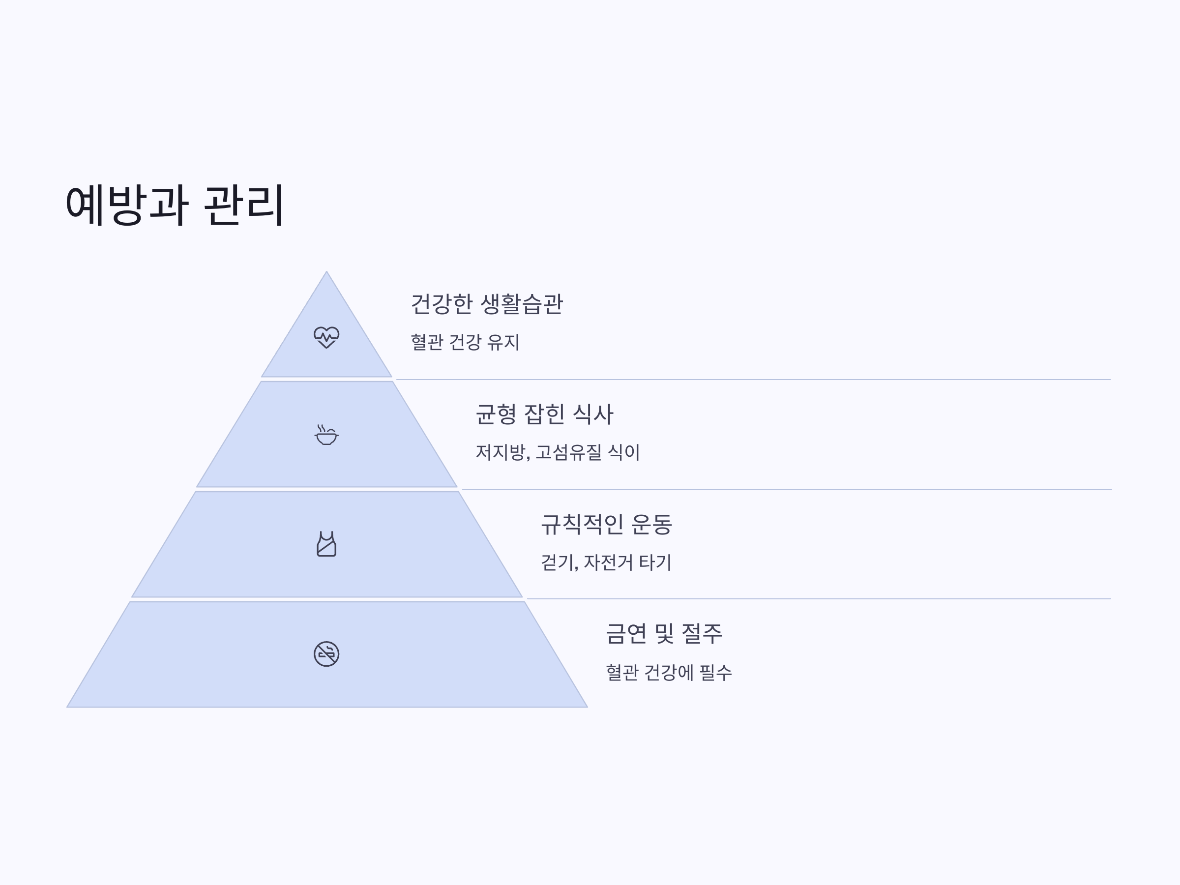 - 건강한 식습관: 지방과 나트륨 섭취를 줄이고, 식이섬유가 풍부한 음식을 섭취합니다.