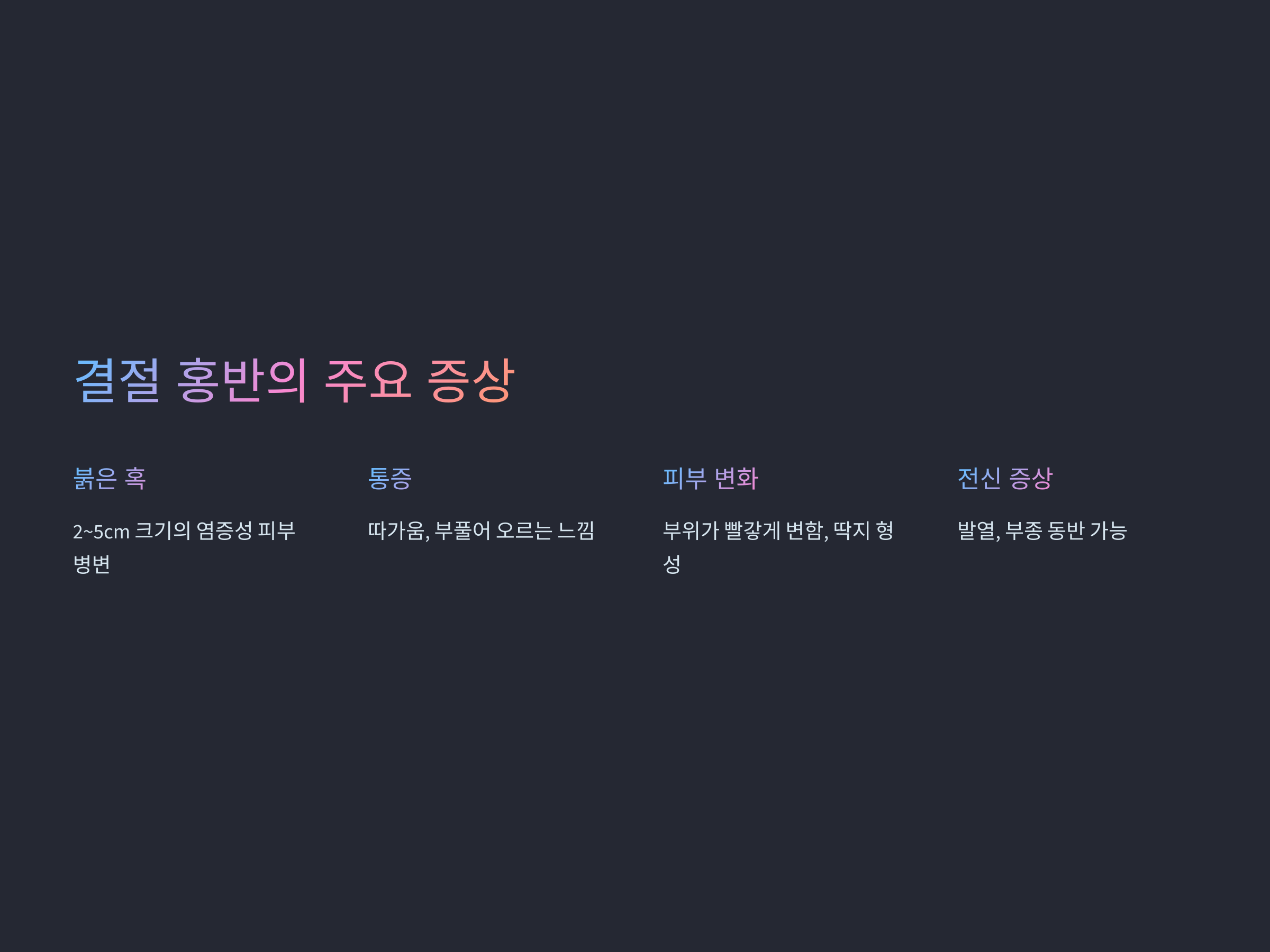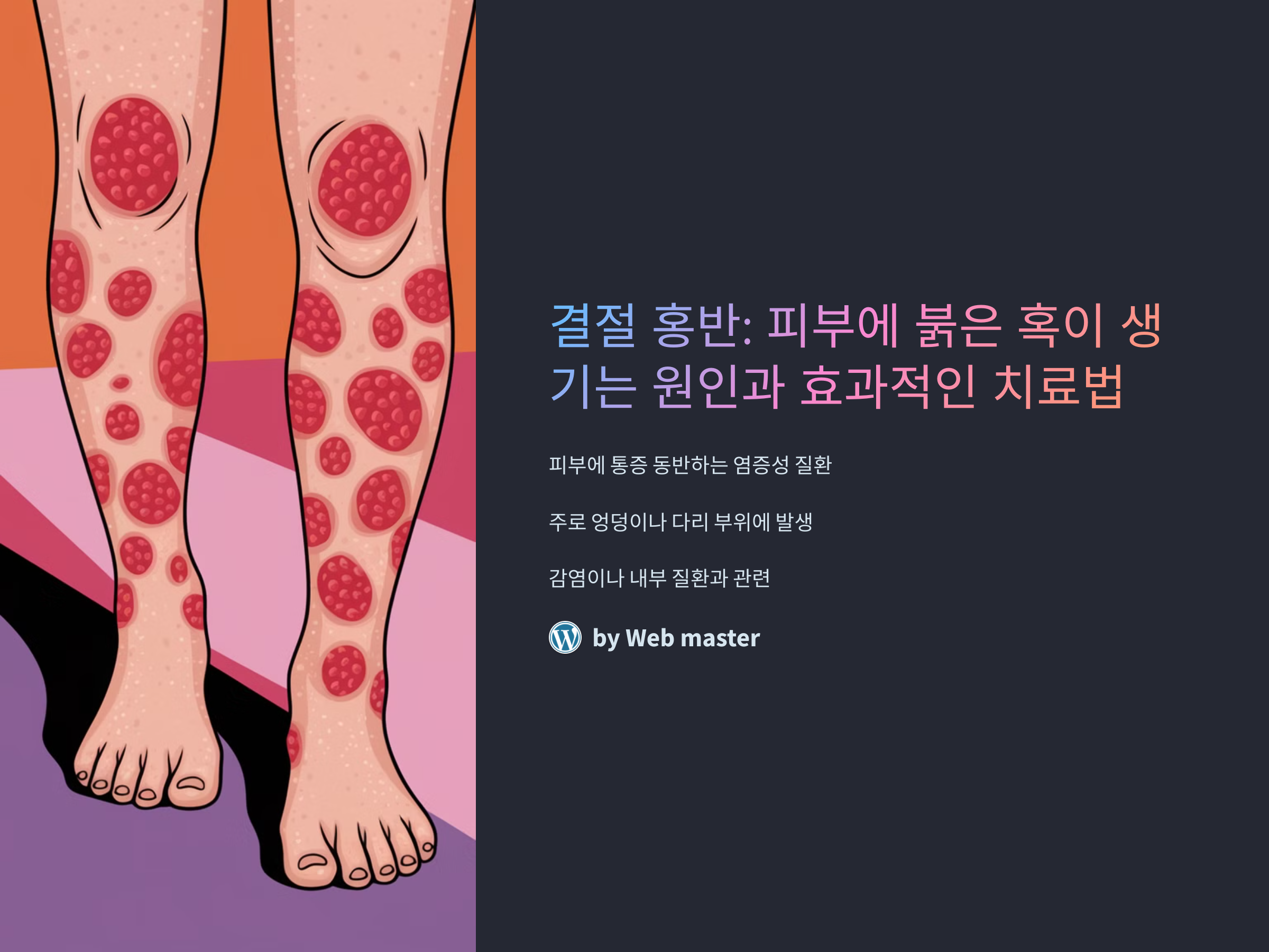결절 홍반은 피부에 붉은 혹이 생기며, 주로 엉덩이나 다리 부위에 많이 나타나는 염증성 질환입니다. 이 질환은 피부에 통증을 동반하며, 종종 그 원인이 감염이나 다른 내부 질환과 관련이 있을 수 있습니다. 결절 홍반을 제대로 이해하지 않으면 증상이 악화되거나 재발할 수 있으므로, 이를 미리 파악하고 적절히 대응하는 것이 중요합니다.