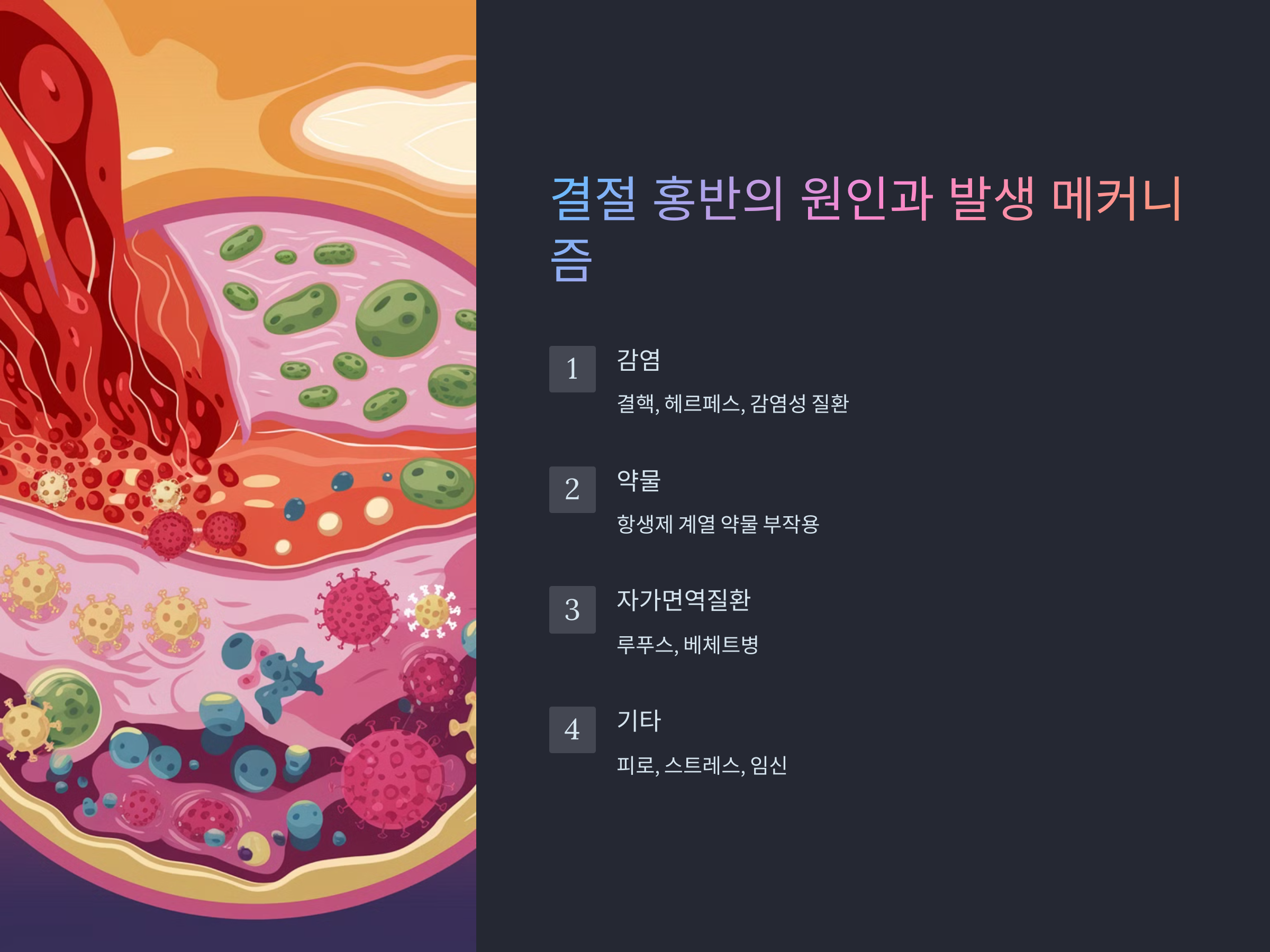 이처럼 결절 홍반은 다양한 원인에 의해 발생할 수 있으며, 원인을 정확히 파악하는 것이 치료의 첫걸음입니다. 적절한 원인 분석을 통해 치료를 시작해야 합니다.