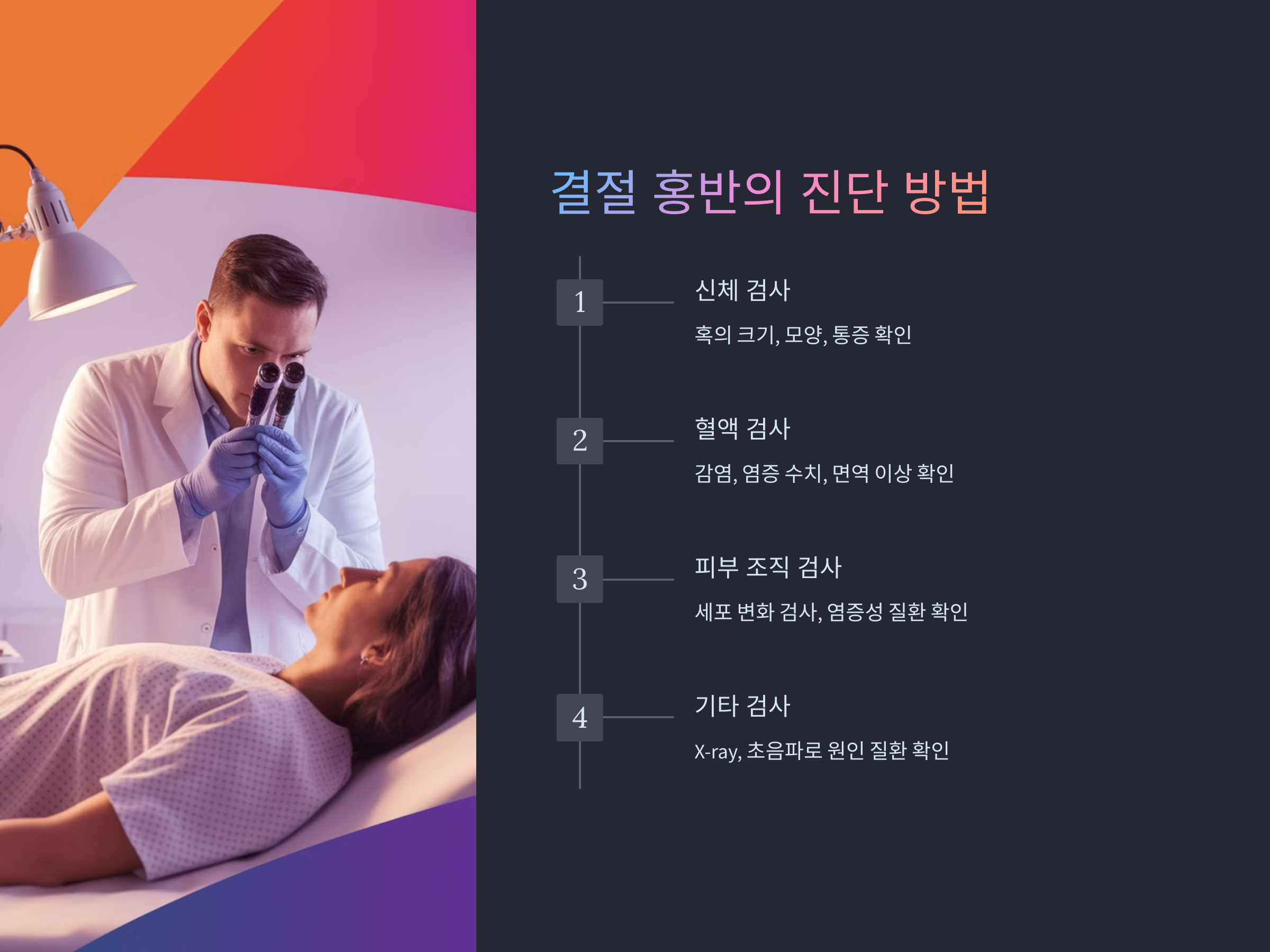 결절 홍반의 진단은 주로 임상적 증상에 의해 이루어집니다. 그러나 원인을 정확하게 파악하기 위해 추가적인 검사도 필요할 수 있습니다. 결절 홍반의 진단 방법은 다음과 같습니다: