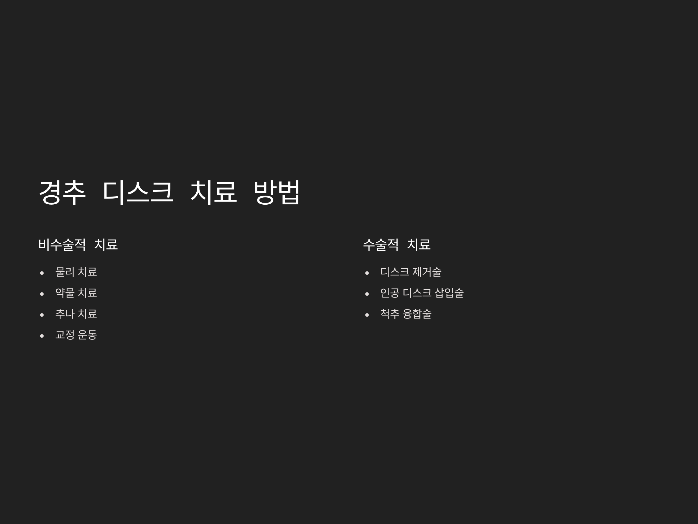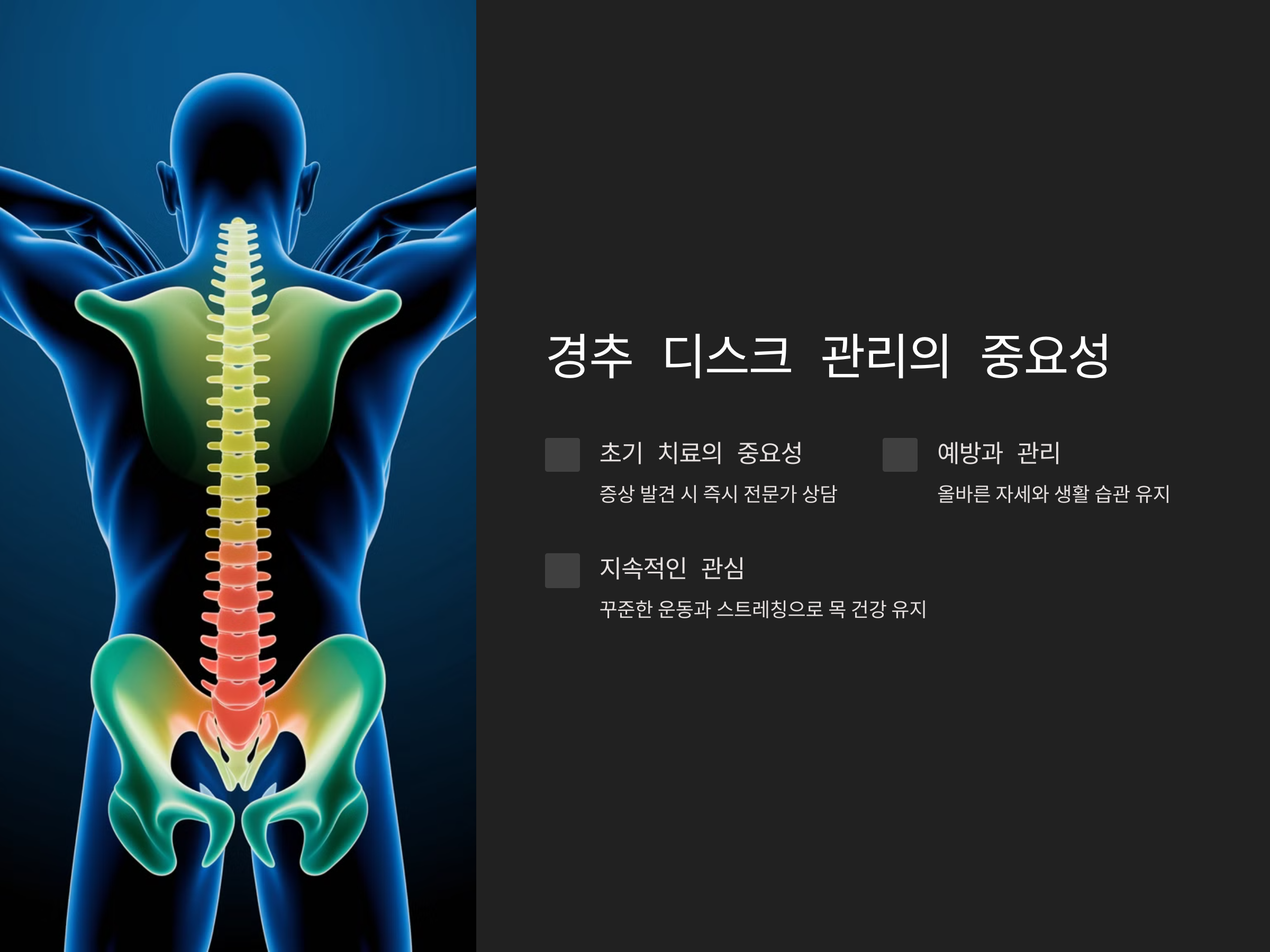 경추 디스크는 많은 사람들이 경험하는 문제지만, 적절한 치료와 예방을 통해 통증을 관리하고 예방할 수 있습니다. 목 통증이 지속되거나 증상이 심해지면 즉시 전문가의 상담을 받는 것이 중요합니다. 건강한 목을 유지하기 위해 꾸준한 운동과 바른 자세를 유지하세요.