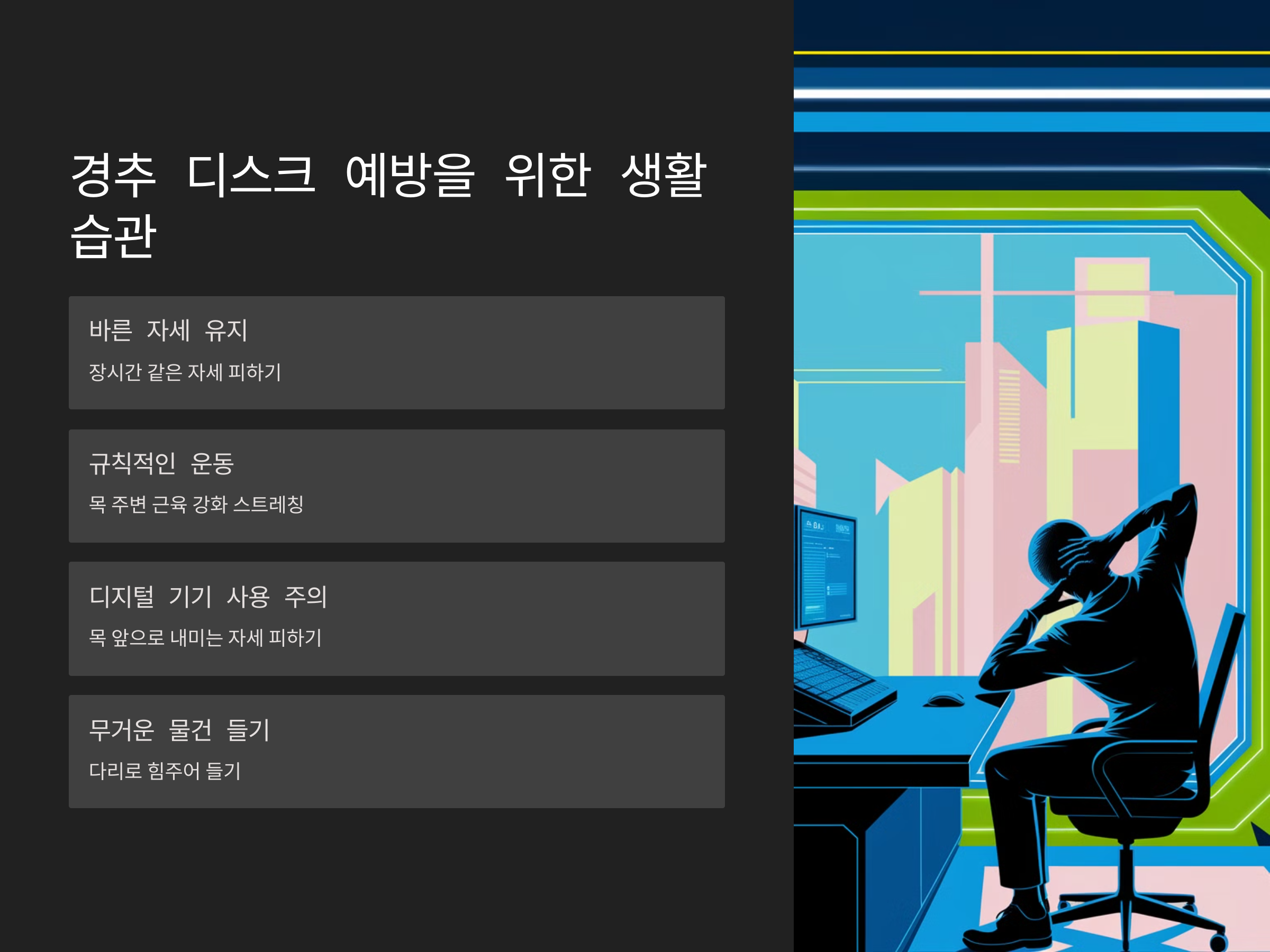 경추 디스크로 인한 목 통증을 예방하는 가장 좋은 방법은 일상 생활에서 주의를 기울이는 것입니다. 잘못된 자세를 피하고, 장시간 같은 자세를 유지하지 않도록 노력하는 것이 중요합니다. 또한, 꾸준한 운동과 스트레칭을 통해 목 주변의 근육을 강화시키는 것도 도움이 됩니다.