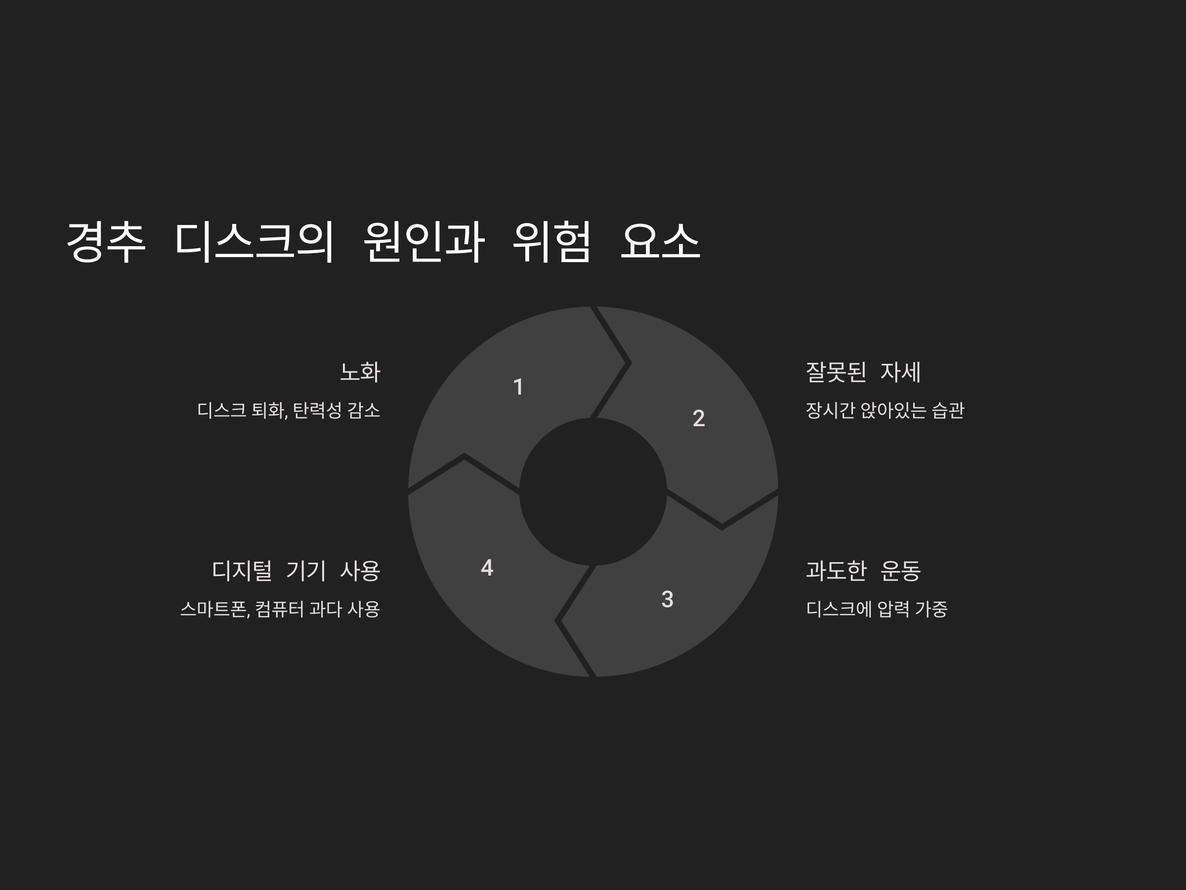 그 외에도 잘못된 자세, 장시간 앉아 있는 생활 습관, 과도한 무리한 운동 등이 디스크에 압력을 가해 문제를 일으킬 수 있습니다. 스마트폰이나 컴퓨터 사용이 많은 현대인에게는 경추 디스크 문제가 더욱 흔히 발생할 수 있습니다.