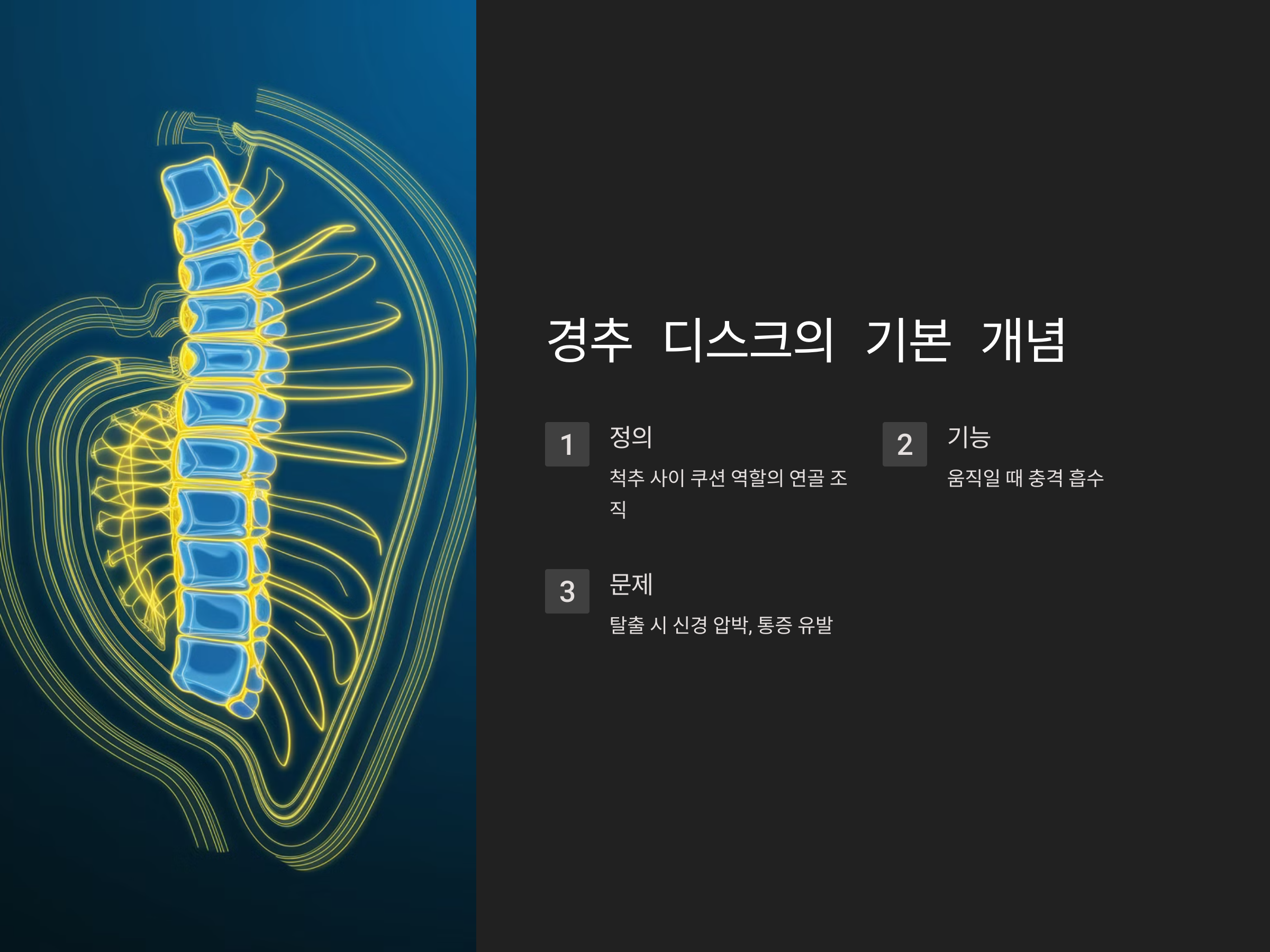경추 디스크는 목 부분에 위치한 척추 사이의 쿠션 역할을 하는 연골 조직입니다. 우리가 움직일 때마다 이 디스크는 척추 뼈 사이에서 충격을 흡수하는 중요한 역할을 하죠. 하지만 노화나 과도한 압력으로 이 디스크가 탈출하거나 부풀어 오르면, 신경을 압박하여 목과 어깨에 심한 통증을 일으킬 수 있습니다. 이는 보통 '경추 디스크 탈출증' 또는 '목 디스크'로 알려져 있습니다.