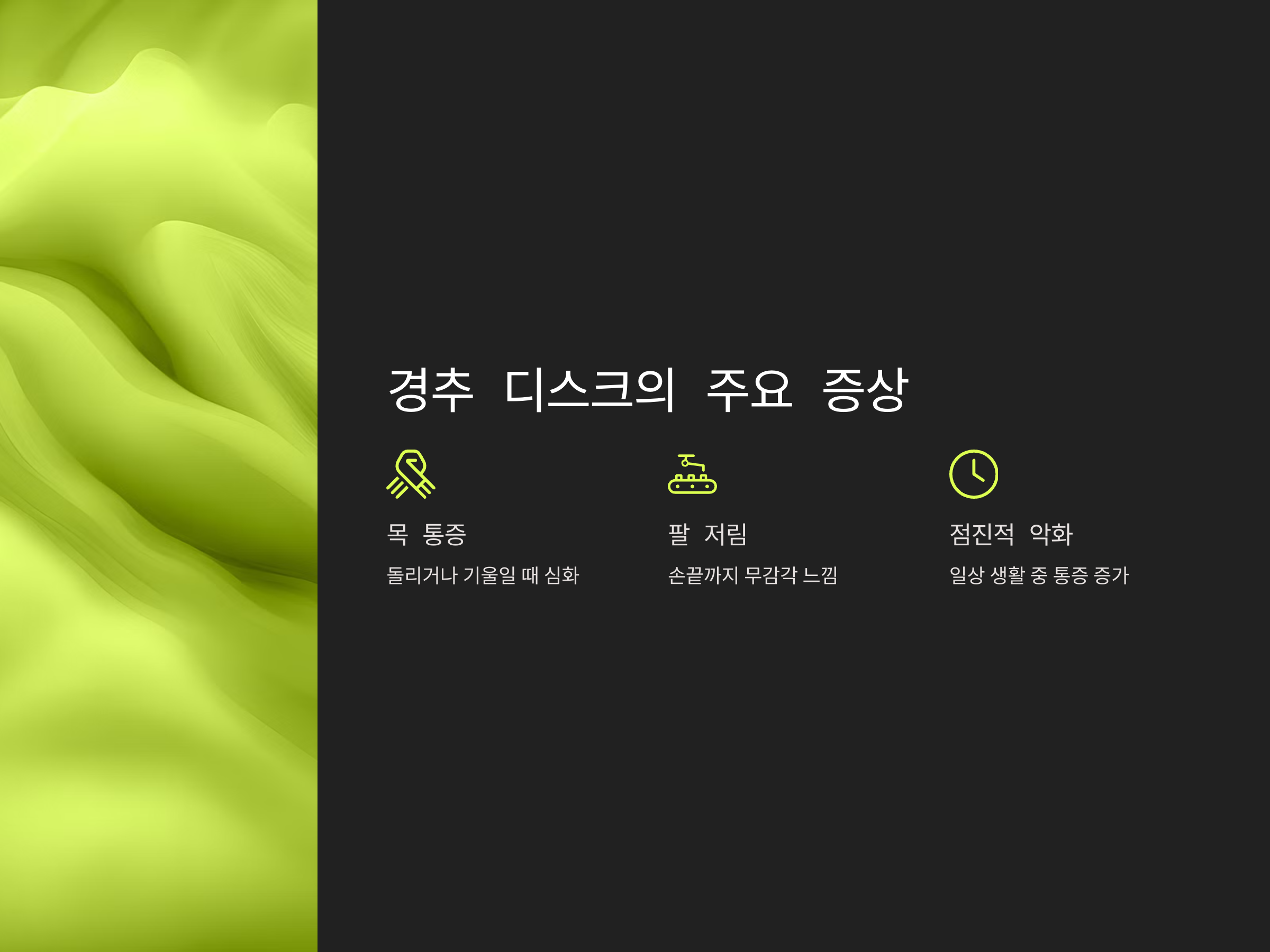 이 외에도, 아침에 일어나면 목 통증이 더 심해지거나, 일정 시간 앉아 있으면 팔꿈치나 손목 부분까지 뻐근해지는 증상도 있을 수 있습니다. 이러한 증상들은 모두 경추 디스크의 문제로 인한 신경 압박으로 발생합니다.